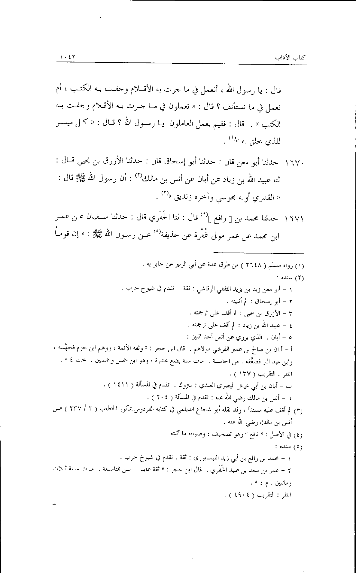 حدثنا أبو معن قال: حدثنا أبو إسحاق قال: حدثنا الأزرق بن يحيى قال: ثنا عبيد الله بن زياد، عن أبان، عن أنس بن مالك أن رسول الله - صلى الله عليه وسلم - قال: ((القدري أوله مجوسي وآخره زنديق)).