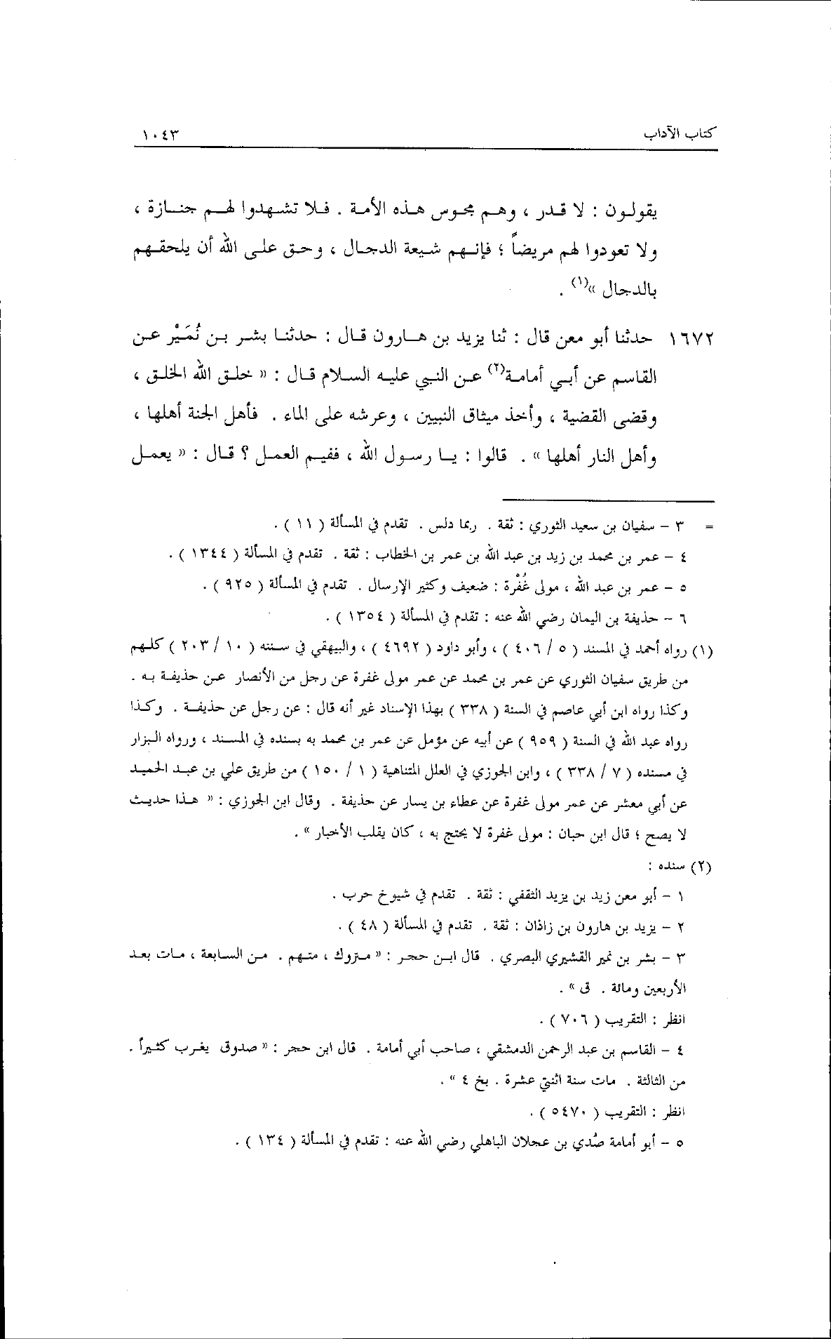 حدثنا أبو معن، قال: ثنا يزيد بن هارون، قال: حدثنا بشر بن نمير، عن القاسم، عن أبي أمامة، عن النبي عليه السلام قال: ((خلق الله الخلق وقضى القضية، وأخذ ميثاق النبيين وعرشه على الماء، فأهل الجنة أهلها، وأهل النار أهلها)) قالوا: يا رسول الله ففيم العمل؟ قال: ((يعمل