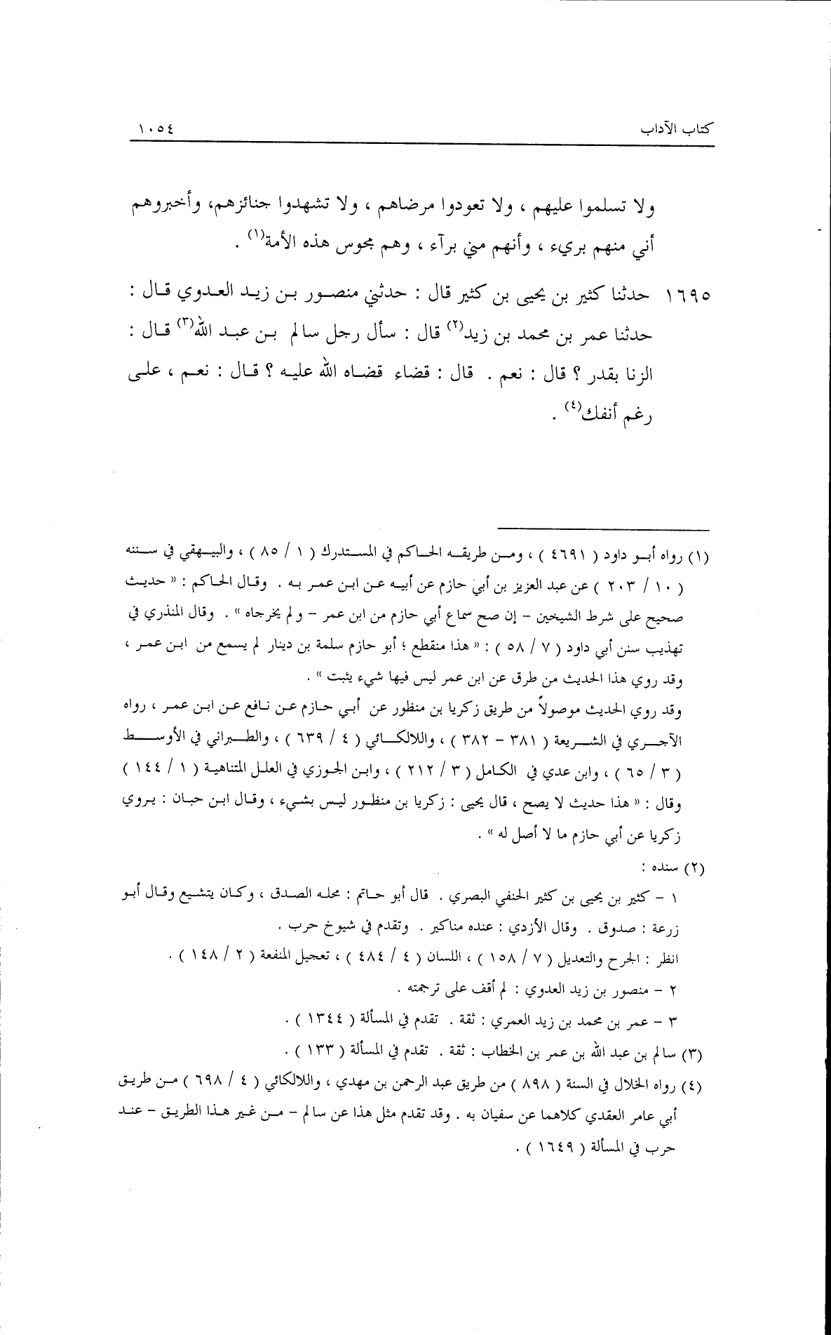 حدثنا كثير بن يحيى بن كثير قال: حدثني منصور بن زيد العدوي قال: حدثنا عمر بن محمد بن زيد قال: سأل رجل سالم بن عبد الله قال: الربا بقدر؟ قال: نعم، قال: قضاء قضاه الله عليه؟ قال: نعم على رغم أنفك.