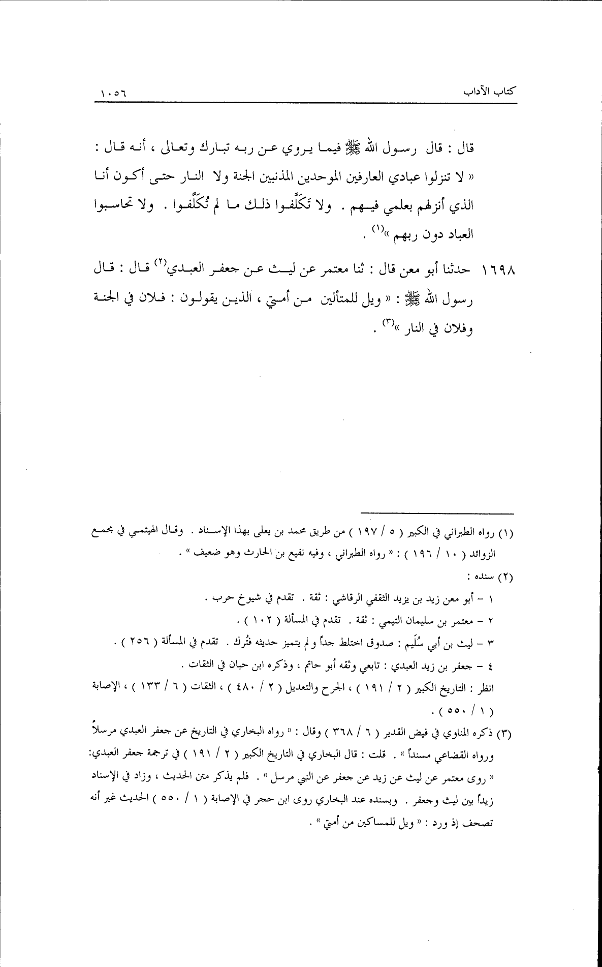 حدثنا أبو معن قال: حدثنا معتمر عن ليث، عن جعفر العبد ي قال: قال رسول الله - صلى الله عليه وسلم -: ((ويل للقتالين من أمتي الذين يقولون: فلان في الجنة، وفلان في النار)).
