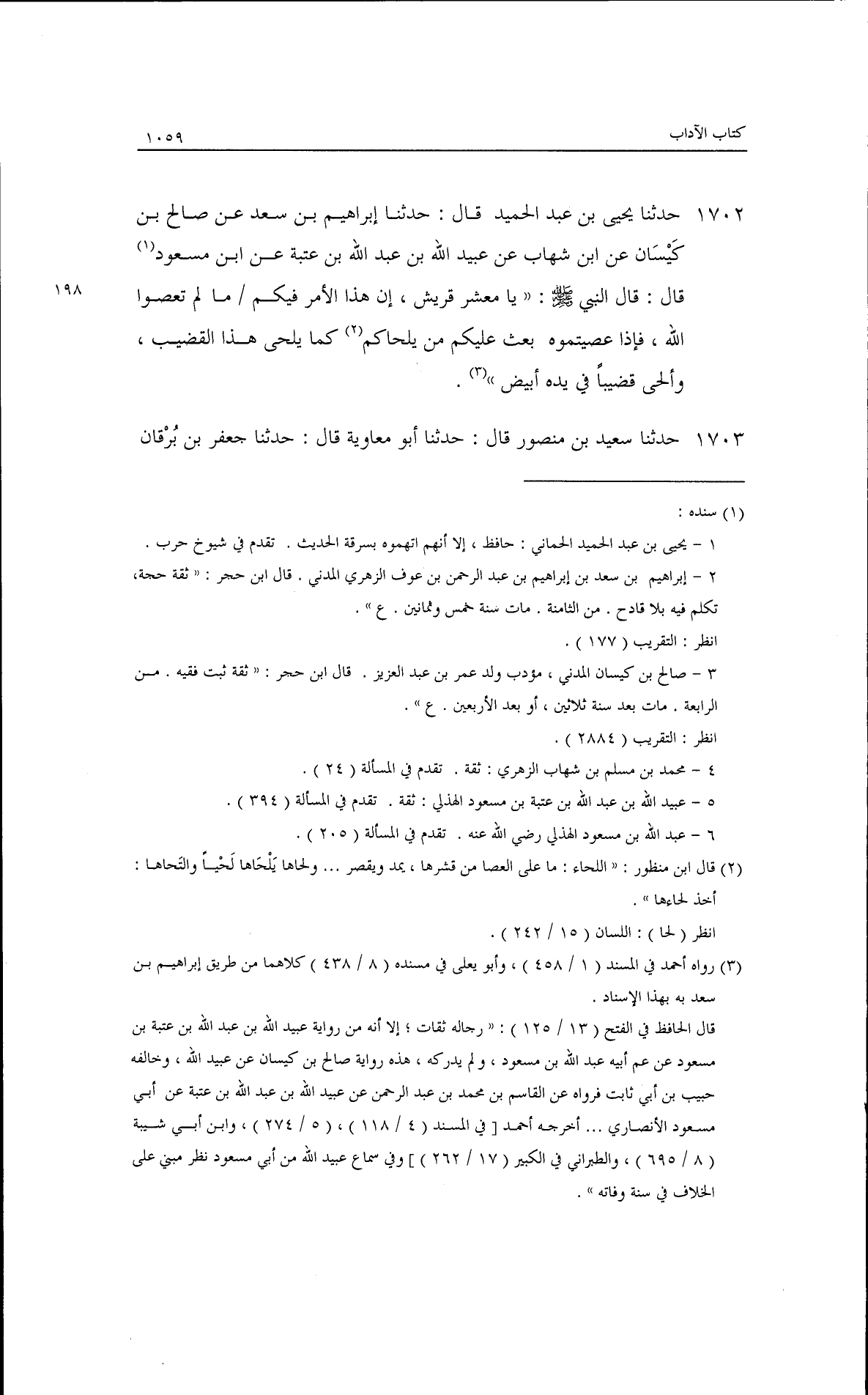 حدثنا يحيى بن عبد الحميد، قال: حدثنا إبراهيم بن سعد، عن صالح بن كبسان، عن ابن شهاب، عن عبيد الله بن عبد الله بن عتبة، عن ابن مسعود قال: قال النبي - صلى الله عليه وسلم -: ((يا معشر قريش إن هذا الأمر فيكم ما لم تعصوا الله، فإذا عصيتموه بعث الله عليكم من يلحاكم كما يلحى هذا القضيب)) والحا قضيبًا في يده أبيض. حدثنا سعيد بن منصور، قال: حدثنا أبو معاوية، قال: حدثنا جعفر بن برقان،