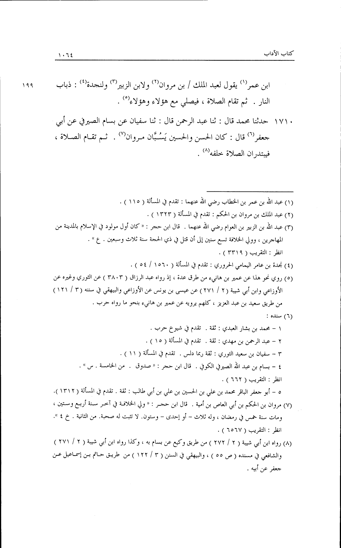 حدثنا محمد قال: ثنا عبد الرحمن قال: ثنا سفيان، عن بسام الصيرفي، عن أبي جعفر قال: كان الحسن والحسين يسبان مروان، ثم تقام الصلاة، فيبتدران الصلاة خلفه.