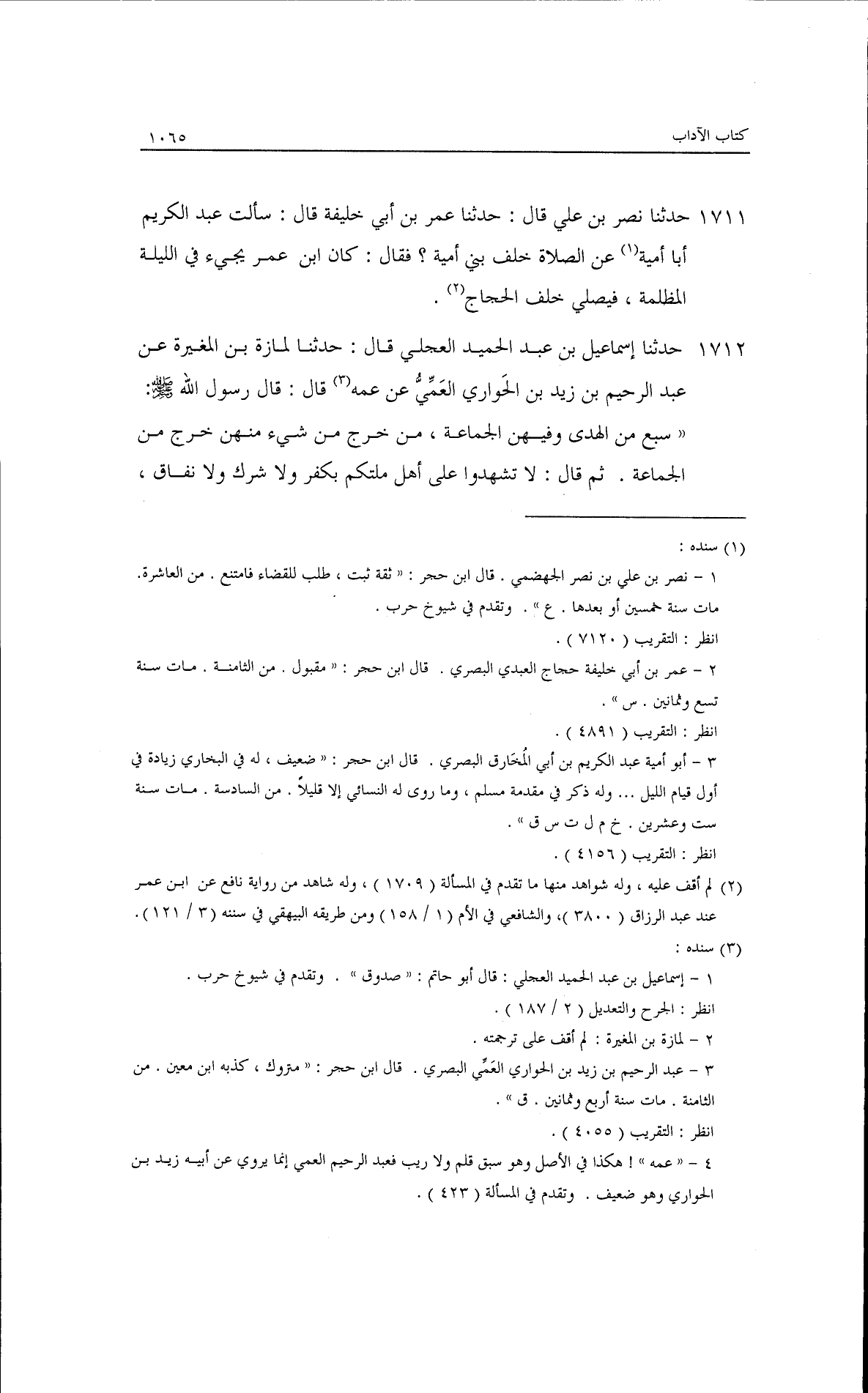 حدثنا نصر بن علي قال: حدثنا عمر بن أبي خليفة قال: سألتُ عبد الكريم أبا أمية عن الصلاة خلف بني أمية، فقال: كان ابن عمر يجئ في الليلة الملمة فيصلي خلف الحجاج.