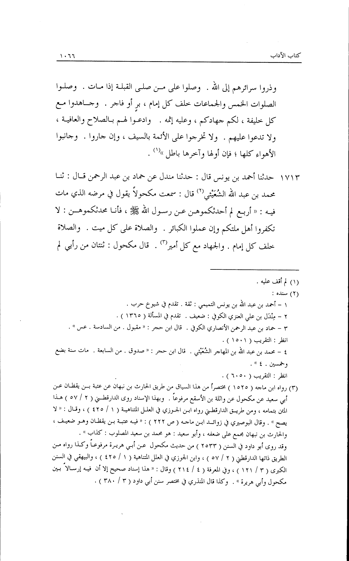 حدثنا أحمد بن يونس قال: حدثنا منذر، عن حماد بن عبد الرحمن قال: ثنا محمد بن عبد الله الشعباني قال: سمعت مكحولًا يقول في مرضه الذي مات فيه: أربع لم أحدثكموهن عن رسول الله - صلى الله عليه وسلم -، فأنا محدثكموهن: ((لا تكفروا أهل ملتكم وإن عملوا الكبائر، والصلاة على كل ميت، والصلاة خلف كل إمام، والجهاد مع كل أمير)).