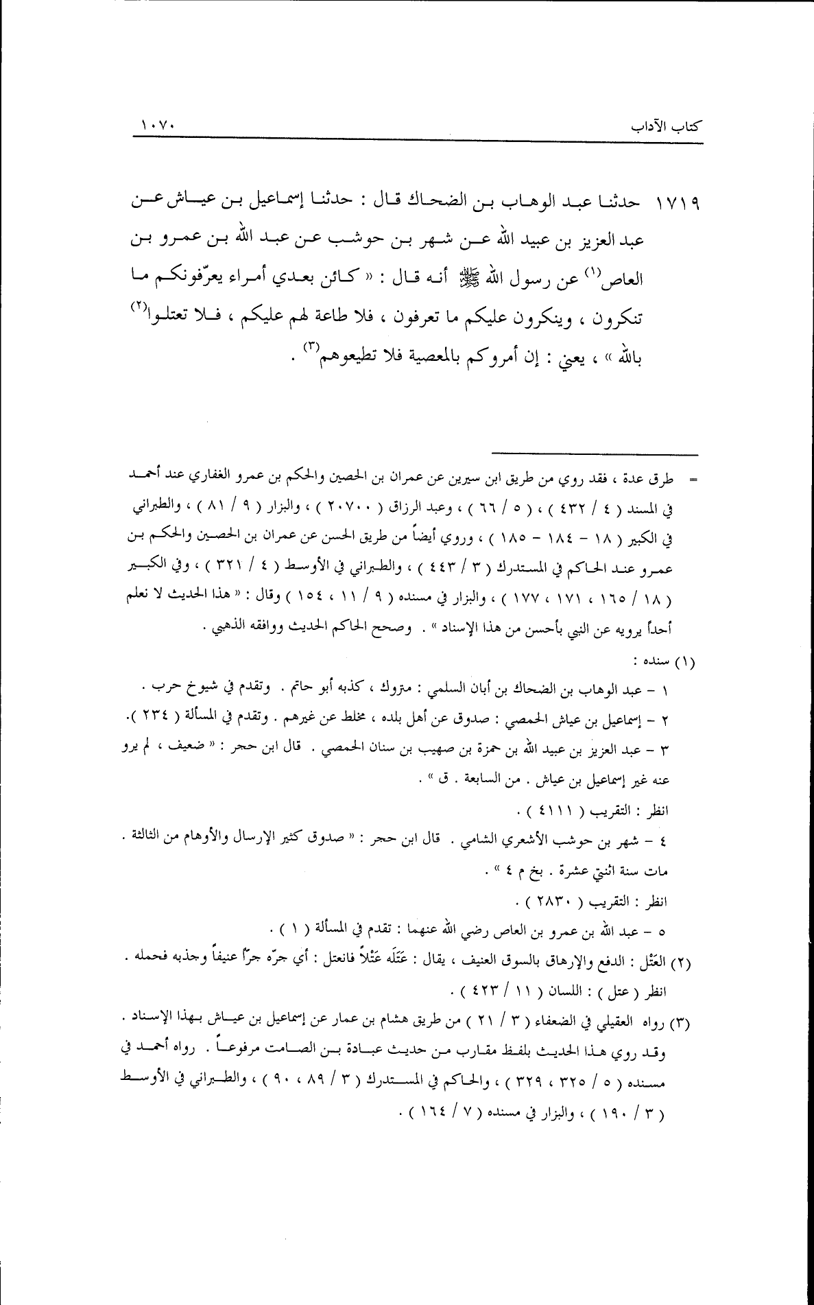 حدثنا عبد الوهاب بن الضحاك قال: حدثنا إسماعيل بن عياش، عن عبد العزيز بن عبيد الله، عن شهر بن حوشب، عن عبد الله بن عمرو بن العاص، عن رسول الله - صلى الله عليه وسلم - أنه قال: ((كائن بعدي أمراء يعرفونكم ما تنكرون، وينكرون عليكم ما تعرفون، فلا طاعة لهم عليكم فلا تقبلن بالله)) يعني: إن أمروكم بالمعصية فلا تطيعوهم.