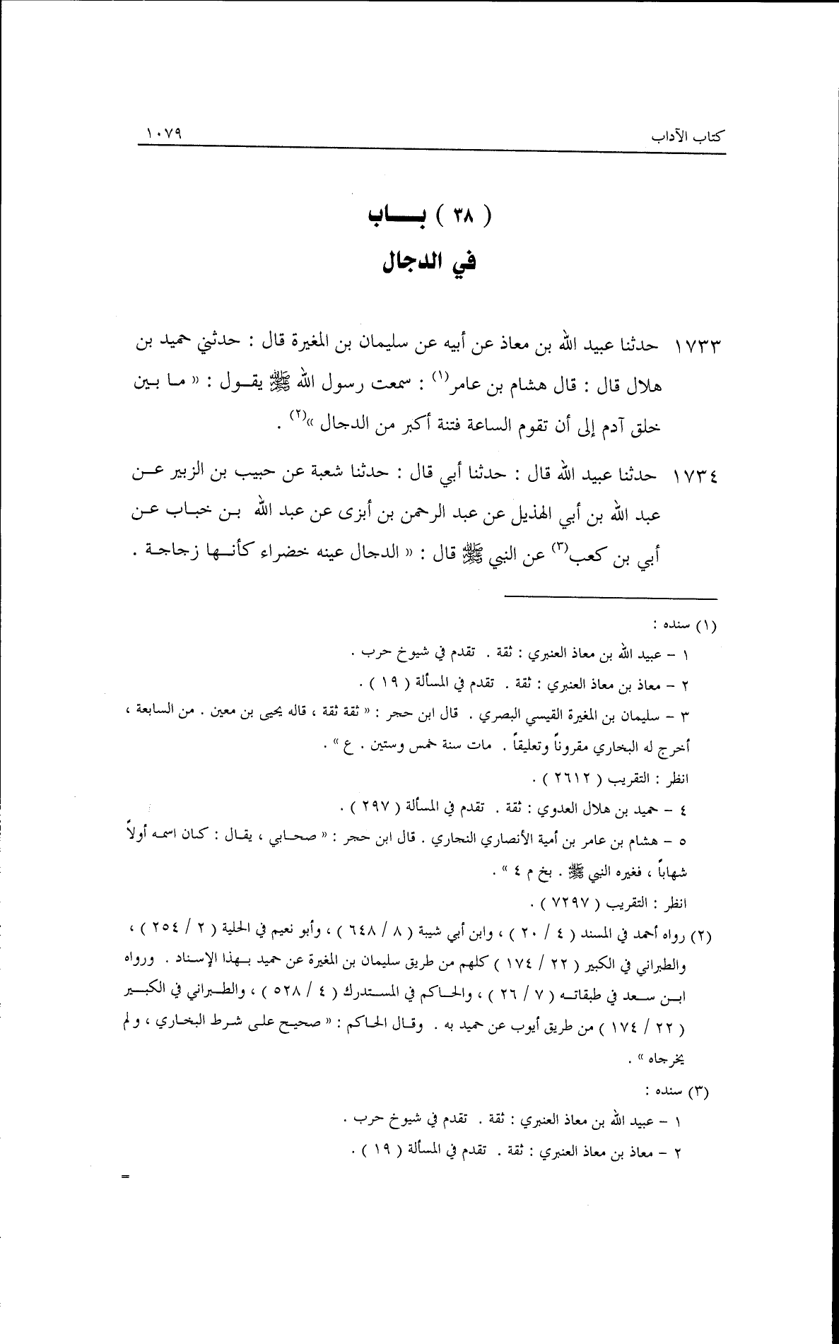 حدثنا عبيد الله بن معاذ، عن أبيه، عن سليمان بن المغيرة قال: حدثني حميد بن هلال قال: قال هشام بن عامر: سمعت رسول الله - صلى الله عليه وسلم - يقول: ((ما بين خلق آدم إلى أن تقوم الساعة فتنة أكبر من الدجال)).