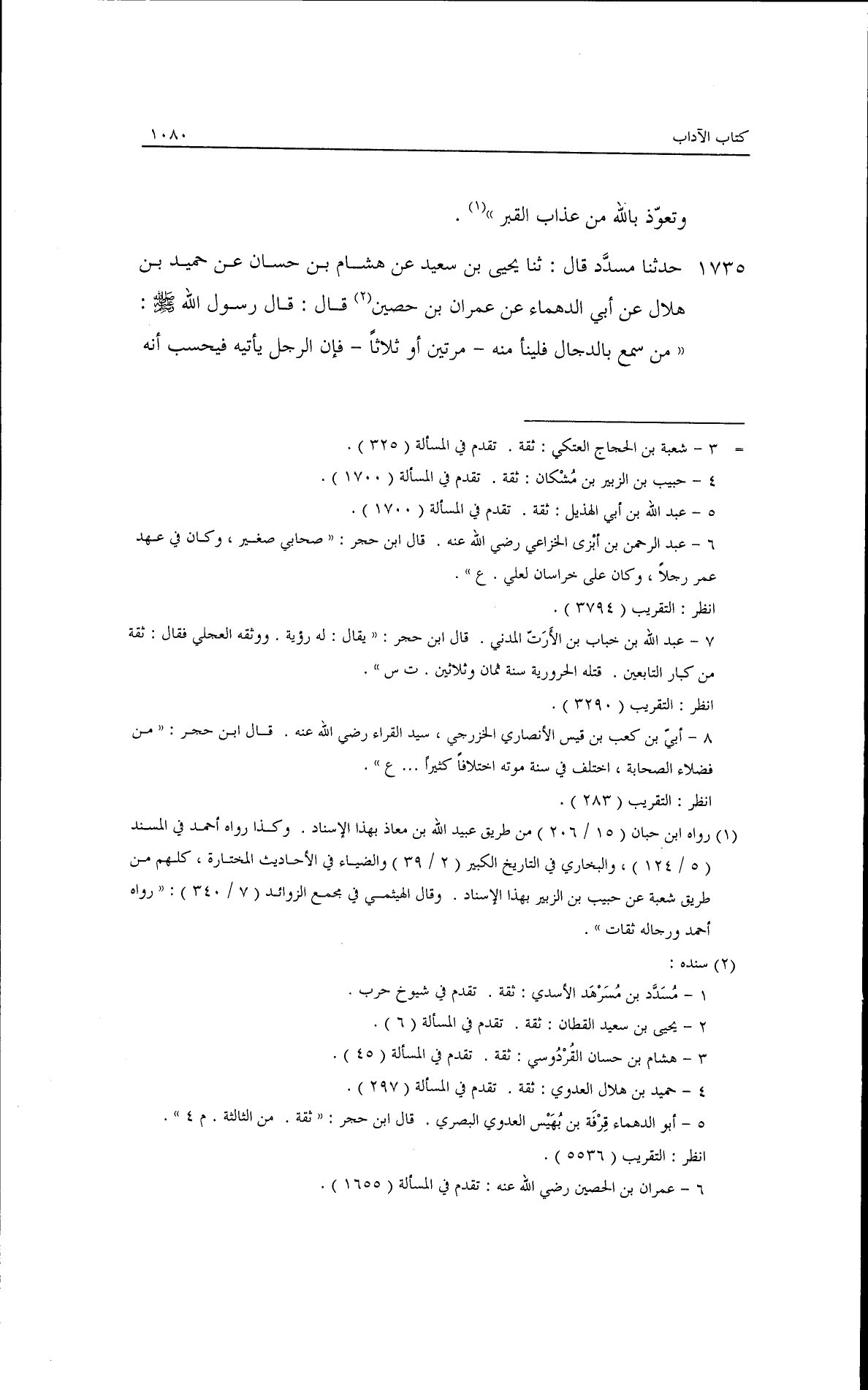 حدثنا مسدد قال: حدثنا يحيى بن سعيد، عن هشام بن حسان، عن حميد بن هلال، عن أبي الدهماء، عن عمران بن حصين قال: قال رسول الله - صلى الله عليه وسلم -: ((من سمع بالدجال فلينأ منه - مرتين أو ثلاثًا - فإن الرجل يأتيه فيحسب أنه