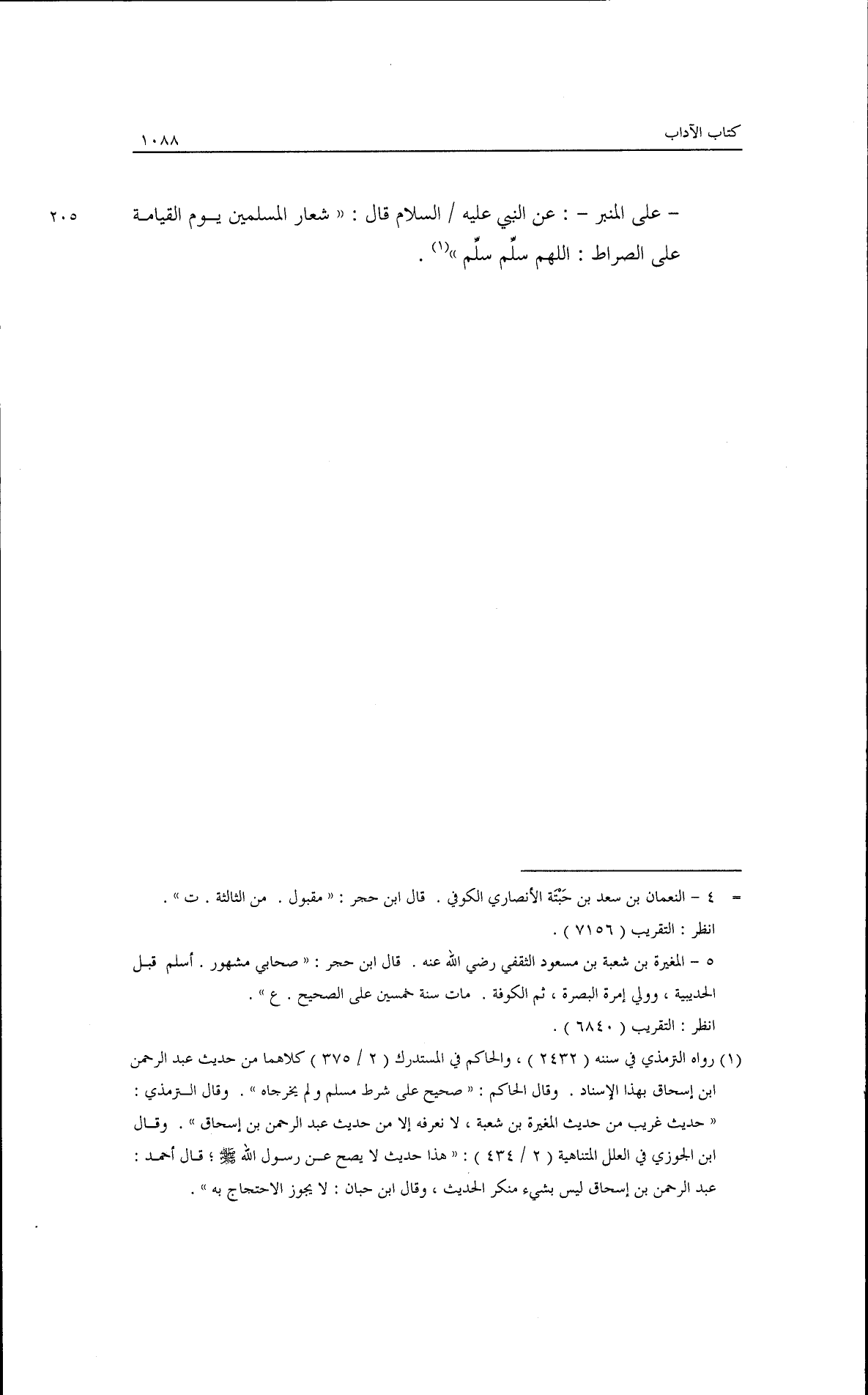 على المنبر: عن النبي عليه السلام قال: ((شعار المسلمين يوم القيامة على الصراط: اللهم سلم سلم)).