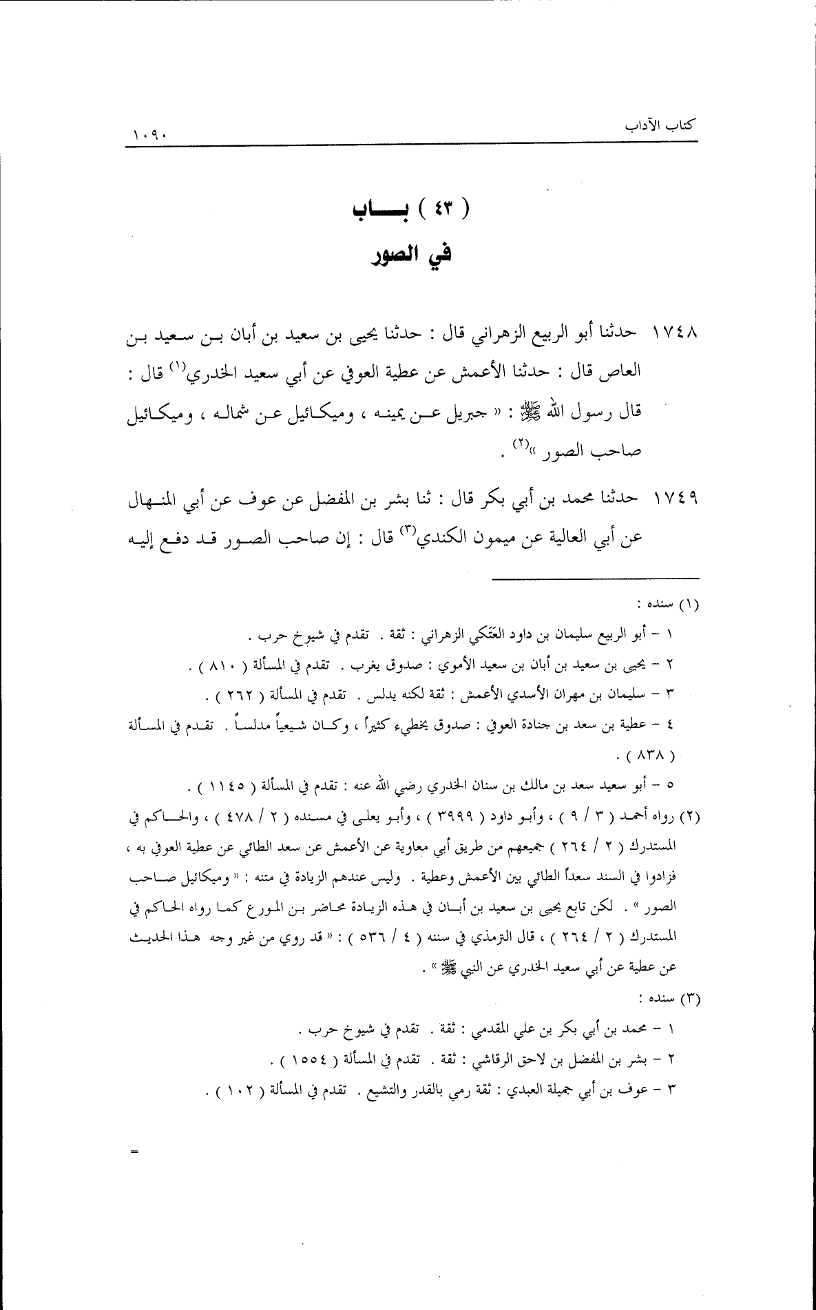حدثنا أبو الربيع الزهراني قال: حدثنا يحيى بن سعيد بن أبان بن سعيد بن العاص قال: حدثنا الأعمش، عن عطية العوفي، عن أبي سعيد الخدري قال: قال رسول الله - صلى الله عليه وسلم -: ((جبريل عن يمينه وميكائيل عن شماله، وميكائيل صاحب الصور)).