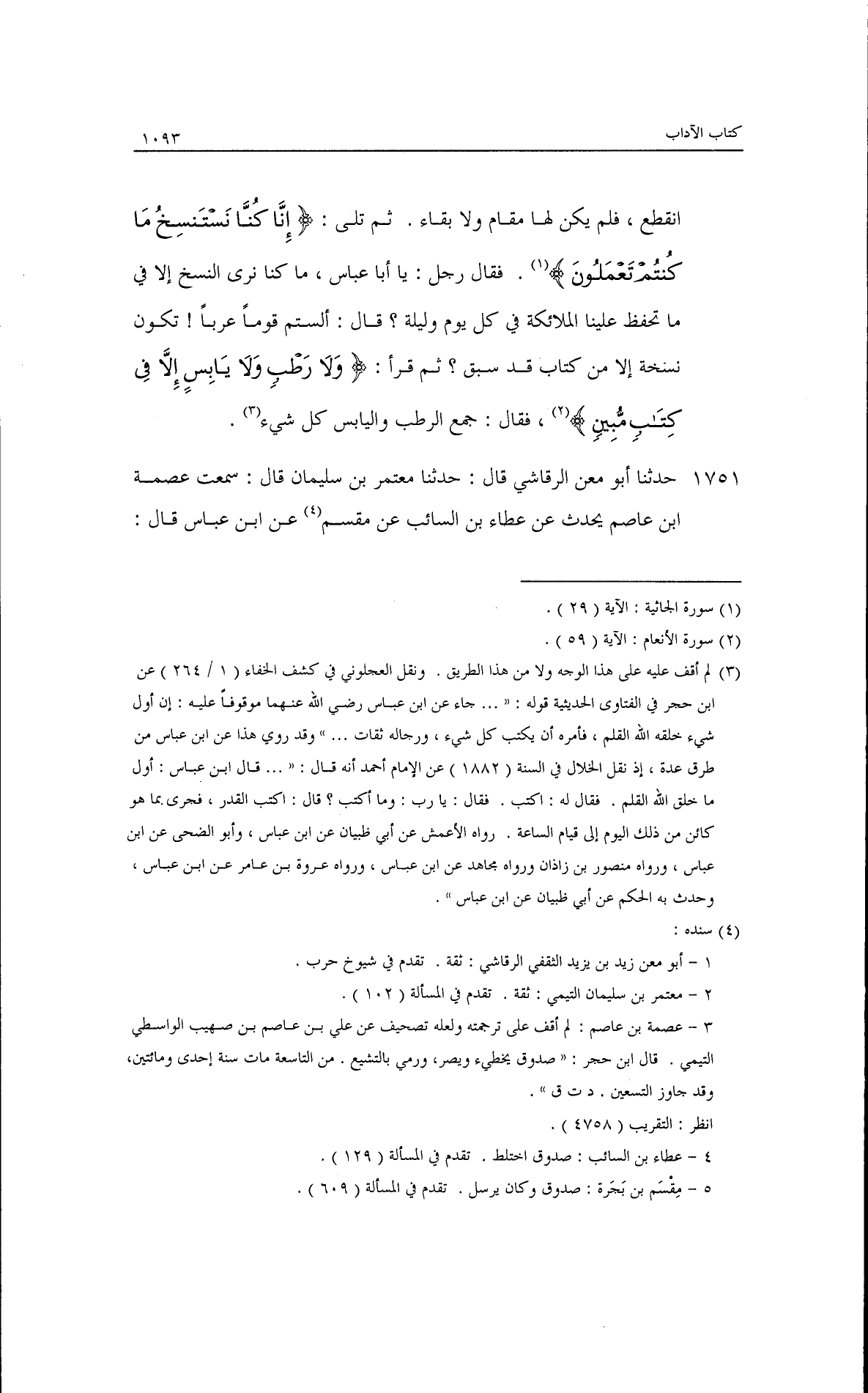 انقطع، فلم يكن لها مقام ولا بقاء ثم تلا: {إِنَّا كُنَّا نَسْتَنسِخُ مَا كُنتُمْ تَعْمَلُونَ} فقال رجل: يا أبا عباس، ما كنا نرى النسخ إلا فيما تحفظ علينا الملائكة في كل يوم وليلة، قال: ألستم قومًا عربًا يكون نسخه إلا من كتاب قد سبق، ثم قرأ: {وَلاَ رَطْبٍ وَلاَ يَابِسٍ إِلاَّ فِي كِتَابٍ مُّبِينٍ} [الأنعام: 59] فقال: جميع الرطب اليابس كل شيء.