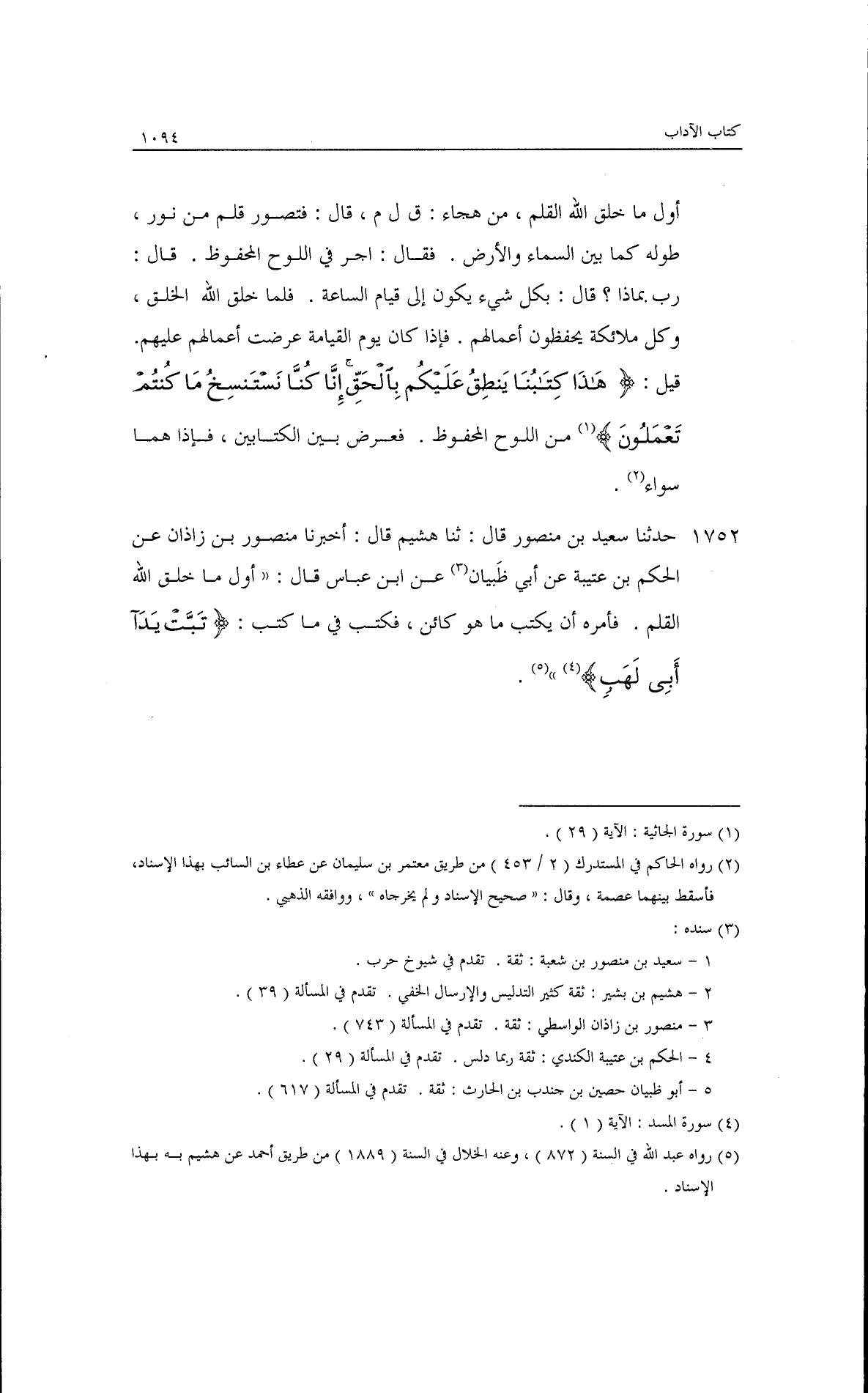 حدثنا سعيد بن منصور قال: ثنا هشيم قال: أخبرنا منصور بن زاذان، عن الحكم بن عيينة، عن أبي ظبيان، عن ابن عباس قال: أول ما خلق الله القلم، فأمره أن يكتب ما هو كائن، فكتب فيما كتب: {تَبَّتْ يَدَا أَبِي لَهَبٍ وَتَبَّ} [المسد: 1].