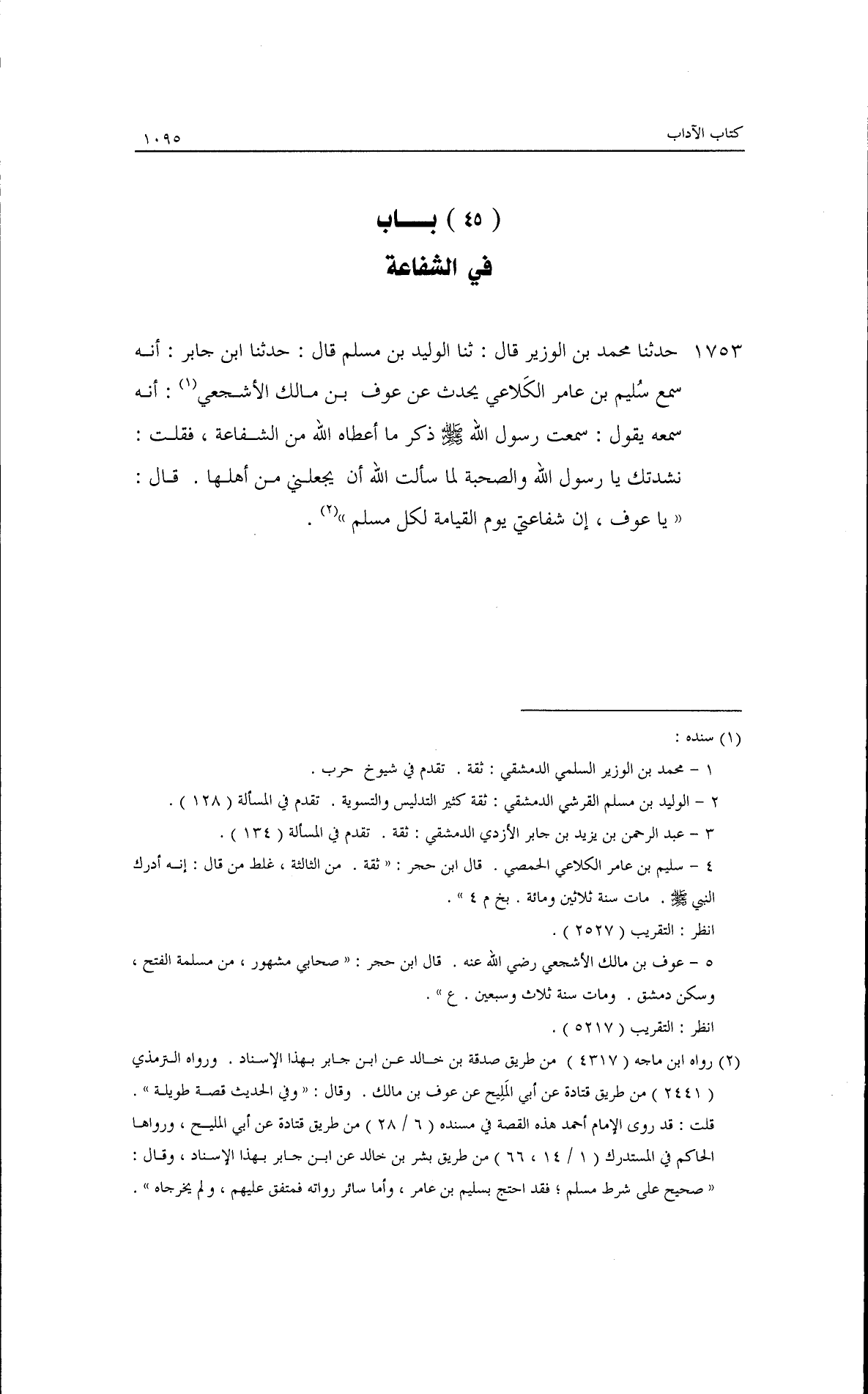 حدثنا محمد بن الوزير، قال: ثنا الوليد بن مسلم، قال: حدثنا ابن جابر أنه سمع سليم بن عامر الكلاعي يحدث عن عوف بن مالك الأشجعي أنه سمعه يقول: سمعت رسول الله - صلى الله عليه وسلم - ذكر ما أعطاه الله من الشفاعة، فقلت: نشدتك يا رسول الله والصحابة لما سألتُ الله أن يجعلني من أهلها. قال: ((يا عوف إن شفاعتي يوم القيامة لكل مسلم)).