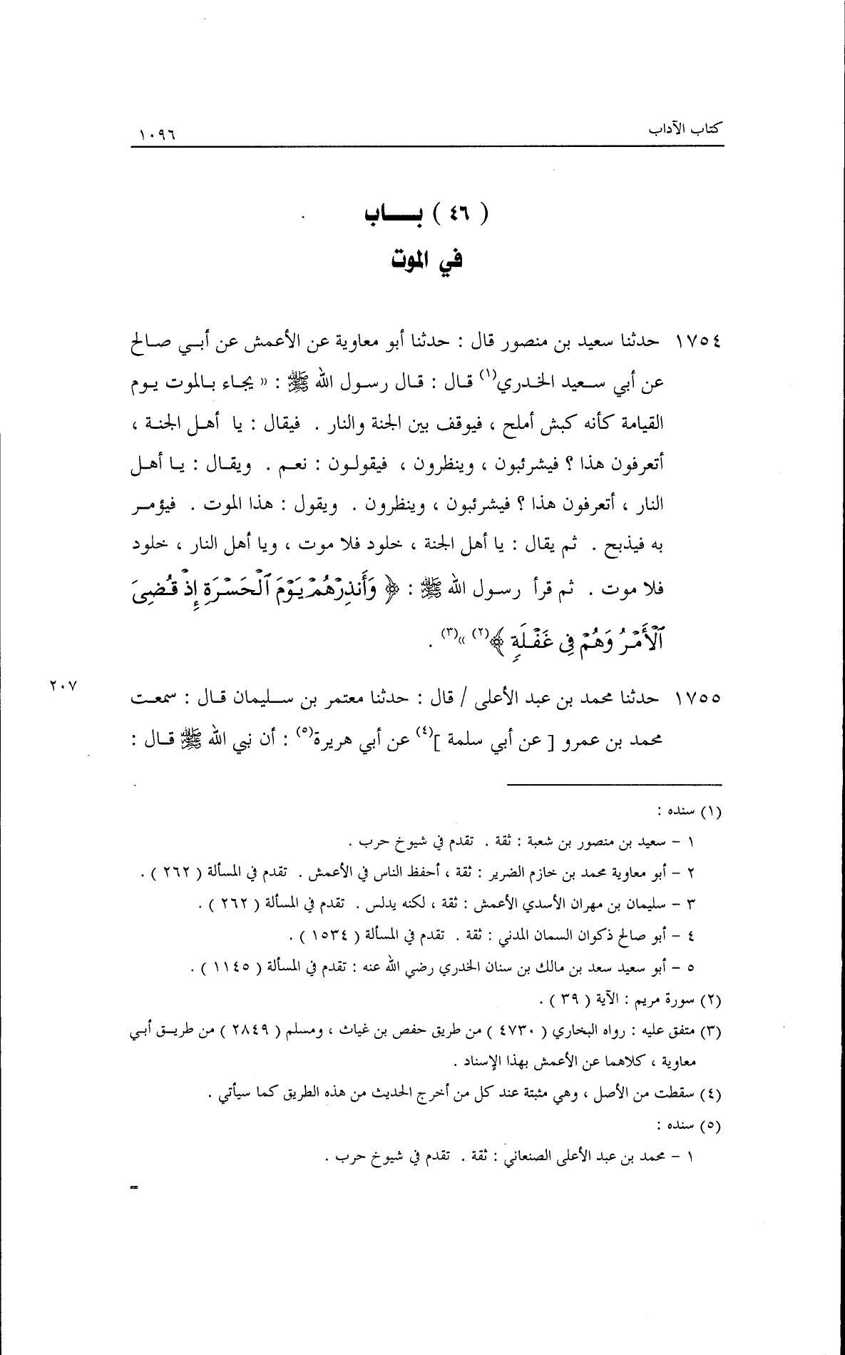 حدثنا سعيد بن منصور، قال: حدثنا أبو معاوية، عن الأعمش، عن أبي صالح، عن أبي سعيد الخدري قال: قال رسول الله - صلى الله عليه وسلم -: ((يجاء بالموت يوم القيامة كأنه كبش أملح، فيوقف بين الجنة والنار، فيقال: يا أهل الجنة أتعرفون هذا؟ فيشرئبون وينظرون، فيقولون: نعم، ويقال: يا أهل النار أتعرفون هذا؟ فيشرئبون وينظرون، فيقول: هذا الموت. فيؤمر به فيذبح، ثم يقال: يا أهل الجنة خلود فلا موت، ويا أهل النار خلود فلا موت))، ثم قرأ رسول الله - صلى الله عليه وسلم -: {وَأَنذِرْهُمْ يَوْمَ الْحَسْرَةِ إِذْ قُضِيَ الْأَمْرُ وَهُمْ فِي غَفْلَةٍ} [مريم: 39].