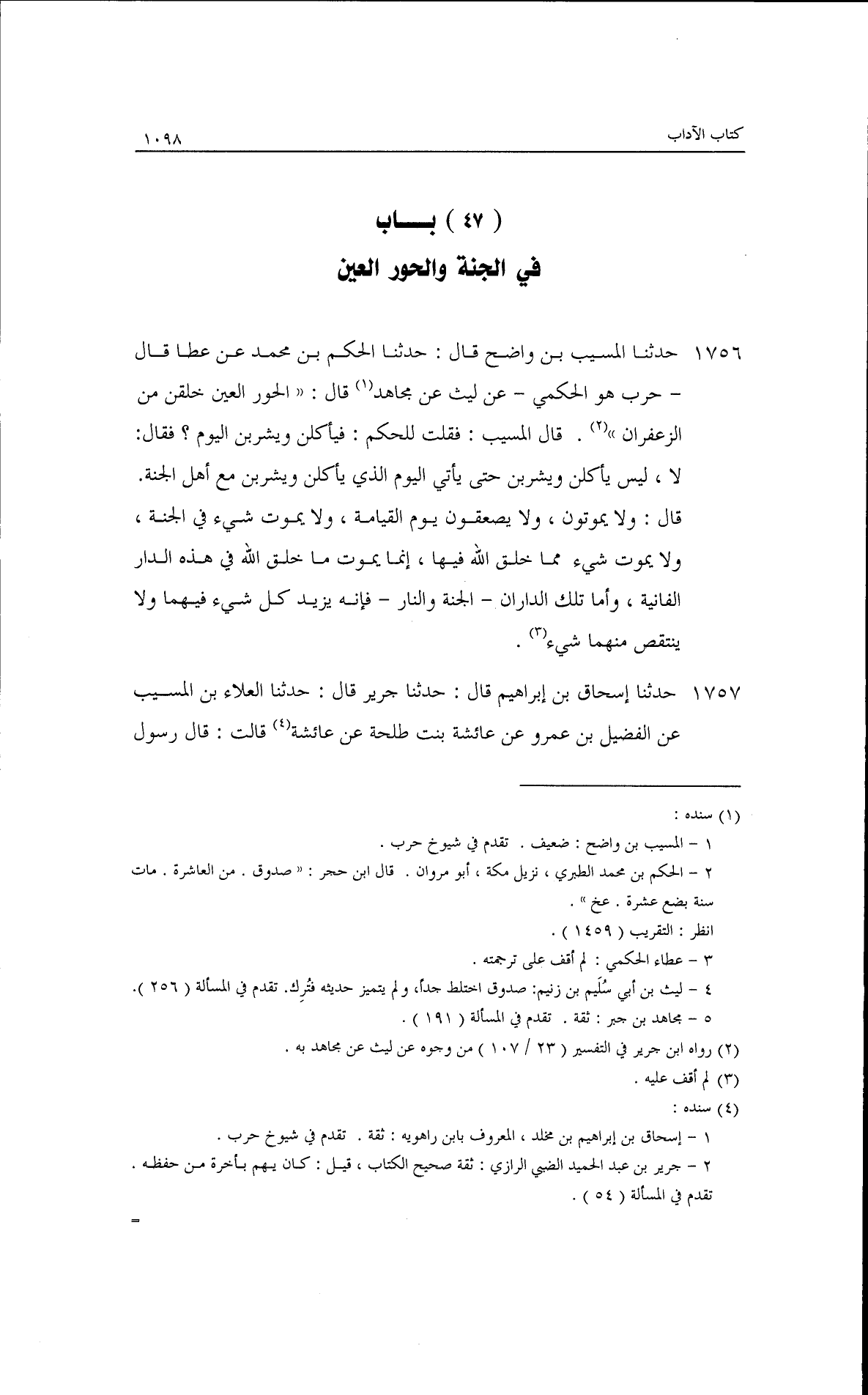حدثنا المسيب بن واضح قال: حدثنا الحكم بن محمد، عن عطاء - قال حرب: هو الحكمي - عن ليث، عن مجاهد قال: الحور العين خلقن من الزعفران. قال المسيب: فقلت للحكم: فيأكلن ويشربن اليوم؟ قال: لا ليس يأكلن ولا يشربن حتى يأتي اليوم الذي يأكلن فيه ويشربن وينعمن مع أهل الجنة، قال: ولا يموتون، ولا يصعقون يوم القيامة، ولا يموت شيء في الجنة، ولا يموت شيء مما خلق الله فيها، إنما يموت ما خُلِق في هذه الدار الفانية، وأما تلك الداران الجنة والنار، فإنه يزيد كل شيء فيهما ولا ينقص منهما شيء. حدثنا إسحاق بن إبراهيم قال: حدثنا جرير قال: حدثنا العلاء بن المسيب عن الفضيل بن عمرو، عن عائشة بنت طلحة، عن عائشة قالت: قال رسول