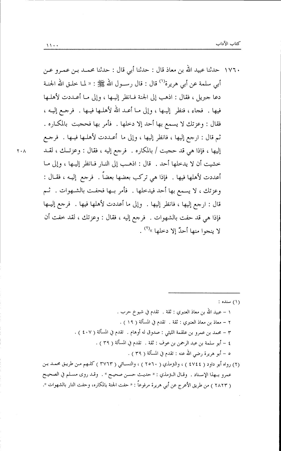 حدثنا عبيد الله بن معاذ قال: حدثنا أبي قال: حدثنا محمد بن عمرو، عن أبي سلمة، عن أبي هريرة قال: قال رسول الله - صلى الله عليه وسلم -: ((لما خلق الله الجنة دعا جبريل فقال: اذهب إلى الجنة فانظر إليها وإلى ماأعددت لأهلها فيها، فجاء فنظر إليها وإلى ما أعد الله لأهلها فيها، فرجع إليه فقال: وعزتك لا يسمع بها أحد إلا دخلها، فأمر بها فحجبت بالمكاره، ثم قال: ارجع إليها فانظر إليها وإلى ما أعددت لأهلها فيها، فرجع إليها فإذا هي قد حجبت/203/بالمكاره، فرجع إليه فقال: وعزتك لقد خشيت أن لا يدخلها أحد. قال: اذهب إلى النار فانظر إليها وإلى ما أعددت لأهلها فيها، فإذا هي تركب بعضها بعضًا، فرجع إليه فقال: وعزتك لا يسمع بها أحد فيدخلها. فأمر بها فحفت بالشهوات، ثم قال: ارجع إليها فانظر إليها وإلى ما أعددت لأهلها فيها، فرجع إليها فإذا هي قد حفت بالشهوات، فرجع إليه فقال: وعزتك لقد خفت أن لا ينجو منها أحد إلا دخلها)).
