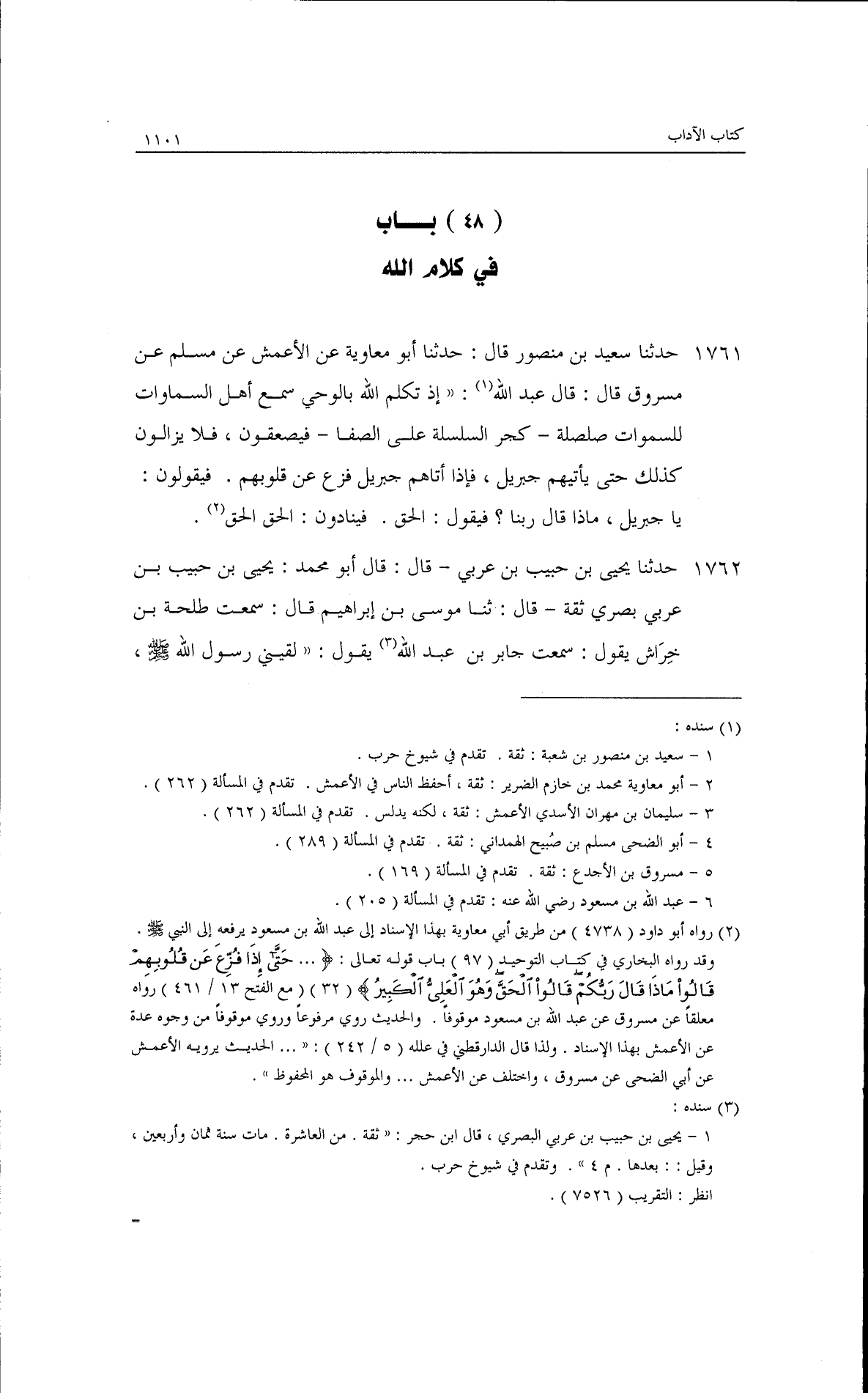 حدثنا سعيد بن منصور قال: حدثنا أبو معاوية، عن الأعمش، عن مسلم، عن مسروق قال: قال عبد الله: إذا تكلم الله بالوحي سمع أهل السموات للسموات صلصلة كمر السلسلة على الصفا فيصعقون، فلا يزالون كذلك حتى يأتيهم جبريل، فإذا أتاهم جبريل فزع عن قلبهم، فيقولن: يا جبريل ماذا قال ربنا؟ فيقول: الحق. فينادون: الحق الحق. حدثنا يحيى بن حبيب بن عدي قال: ثنا أبو محمد يحيى بن حبيب بن عدي - بصري ثقة - قال: ثنا موسى عن إبراهيم قال: سمعت طلحة بن حراش يقول: سمعت جابر بن عبد الله يقول: لقيني رسول الله - صلى الله عليه وسلم -