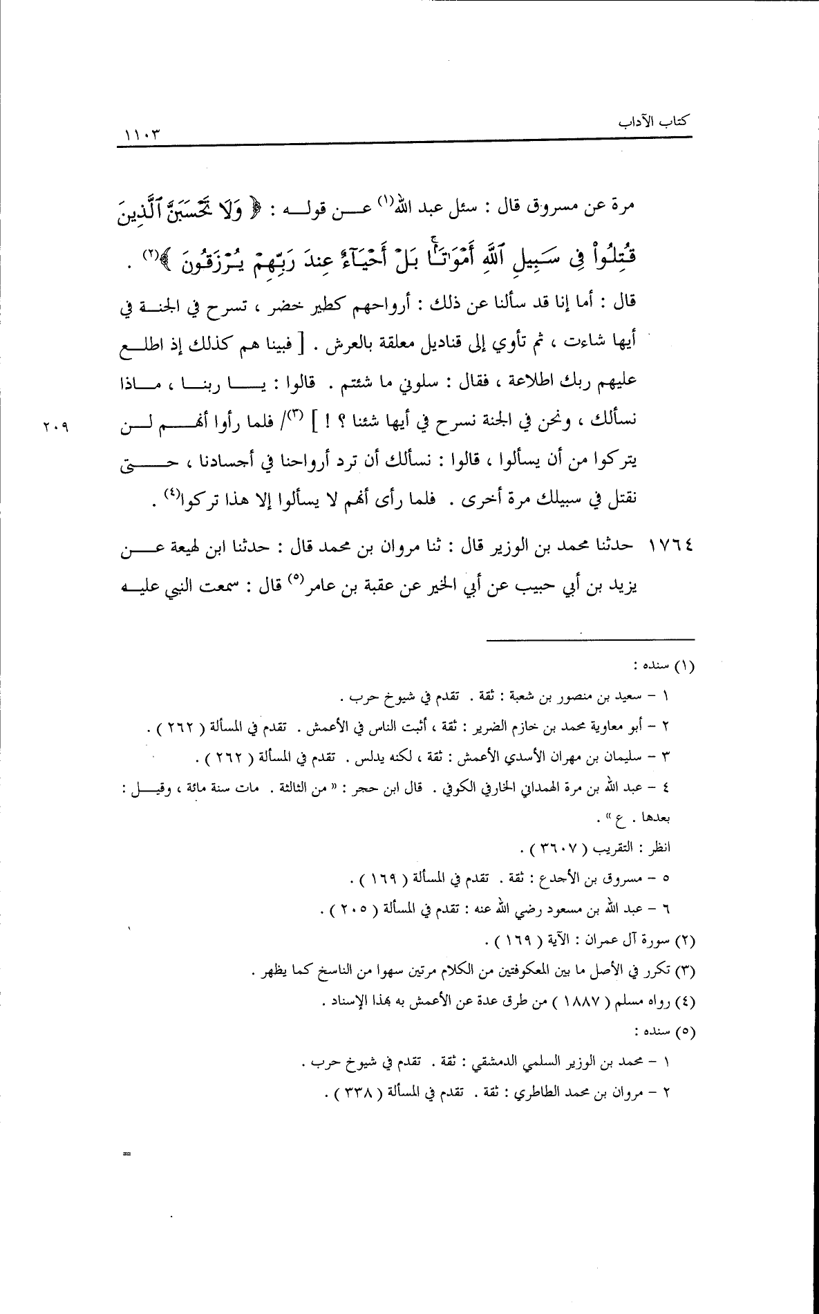 مرة، عن مسروق قال: سئل عبد الله عن قوله: {وَلاَ تَحْسَبَنَّ الَّذِينَ قُتِلُواْ فِي سَبِيلِ اللهِ أَمْوَاتًا بَلْ أَحْيَاء عِندَ رَبِّهِمْ يُرْزَقُونَ} [آل عمران: 169] قال: أما إنا قد سألنا عن ذلك أرواحهم كطير خضر يسرح في الجنة في أيها شاءت، ثم تأوي إلى قناديل معلقة بالعرش فبيناهم كذلك إذا طلع عليهم ربك اطِّلاعة فقال: سلوني ما شئتم، قالوا: يا ربنا وماذا نسألك ونحن في الجنة نسرح في أيها شئنا. فبيناهم كذلك إذ اطلع عليهم ربك اطلاعة فقال: سلوني ما شئتم. قالوا: يا ربنا لماذا نسألك ونحن في الجنة نسرح في أيها شئنا، فلما رأوا أنهم لن يتركوا من أن يسألوا قالوا: نسألك أن ترد أرواحنا في أجسادنا حتى نقتل في سبيلك مرة أخرى، فلما رأى أنهم لا يسألون إلا هذا تركوا.