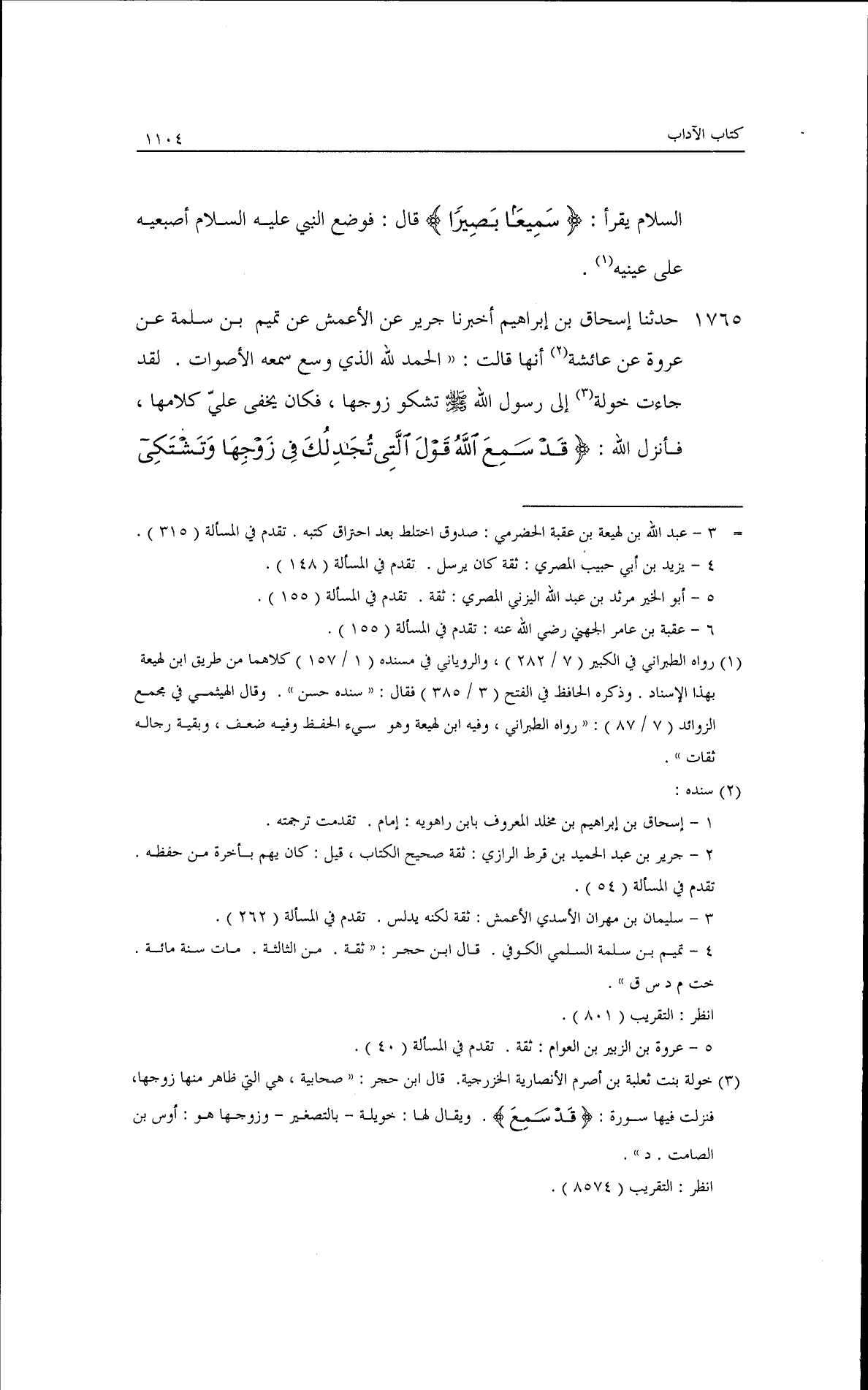 السلام يقرأ: {سميعًا بصيرا} قال: فوضع النبي عليه السلام إصبعيه على عينيه. حدثنا إسحاق بن إبراهيم، أخبرنا جرير، عن الأعمش، عن تميم بن سلمة، عن عروة، عن عائشة أنها قالت: الحمد لله الذي وسع سمعه الأصوات، لقد جاءت خولة إلى رسول الله - صلى الله عليه وسلم - تشكو زوجها فكان يخفى عليّ كلامها، فأنزل الله: {قَدْ سَمِعَ اللَّهُ قَوْلَ الَّتِي تُجَادِلُكَ فِي زَوْجِهَا وَتَشْتَكِي