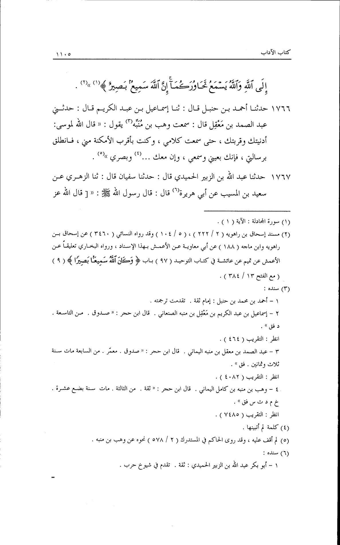 حدثنا أحمد بن حنبل، قال: ثنا إسماعيل بن عبد الكريم، قال: حدثني عبد الصمد بن معقل، قال: سمعت وهب بن منبه يقول: قال الله لموسى: أدنيتك وقربتك حتى سمعت كلامي. وكنت بأقرب الأمكنة مني، فانطلق برسالتي، فإنك بعيني وسمعي، وإن معك أيدي وبصري.