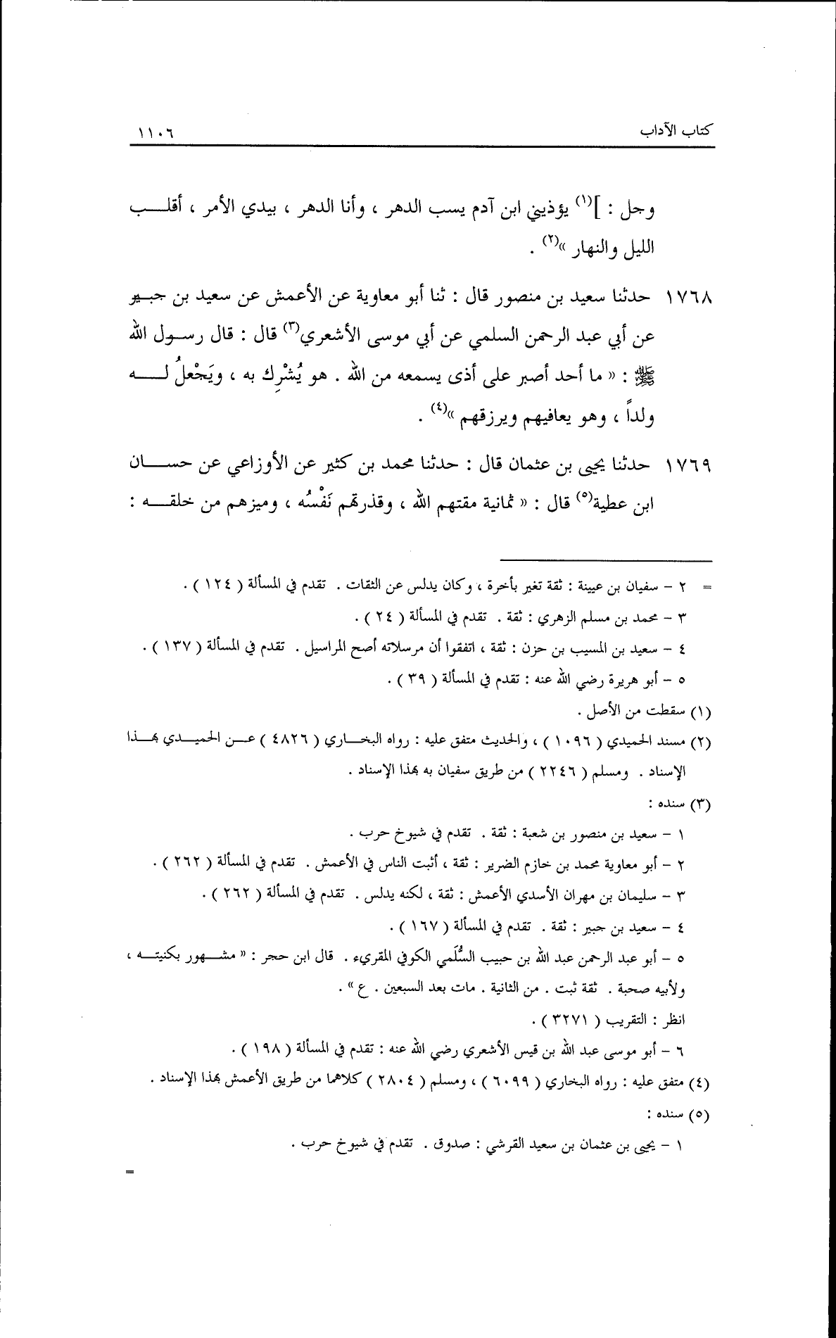 حدثنا سعيد بن منصور قال: ثنا أبو معاوية، عن الأعمشق، عن سعيد بن جبير، عن أبي عبد الرحمن السلمي، عن أبي موسى الأشعري قال: قال رسول الله - صلى الله عليه وسلم -: ((ما أحد أصبر على أذى يسمعه من الله هو يشرك به، ويجعل له ولدًا وهو يعافيهم ويرزقهم)).