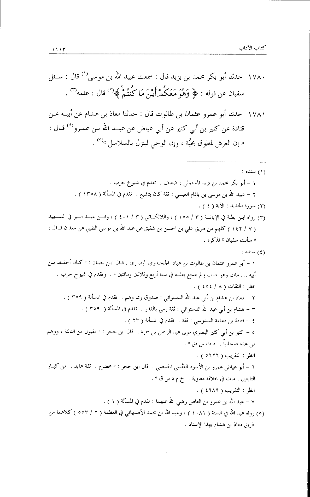 حدثنا أبو عمرو عثمان بن طالوت، قال: حدثنا معاذ بن هشام، عن أبيه، عن قتادة، عن كثير بن أبي كثير، عن أبي عياض، عن عبد الله بن عمرو قال: إن العرش لمطوف بحية، وإن الوحي لينزل بالسلاسل.