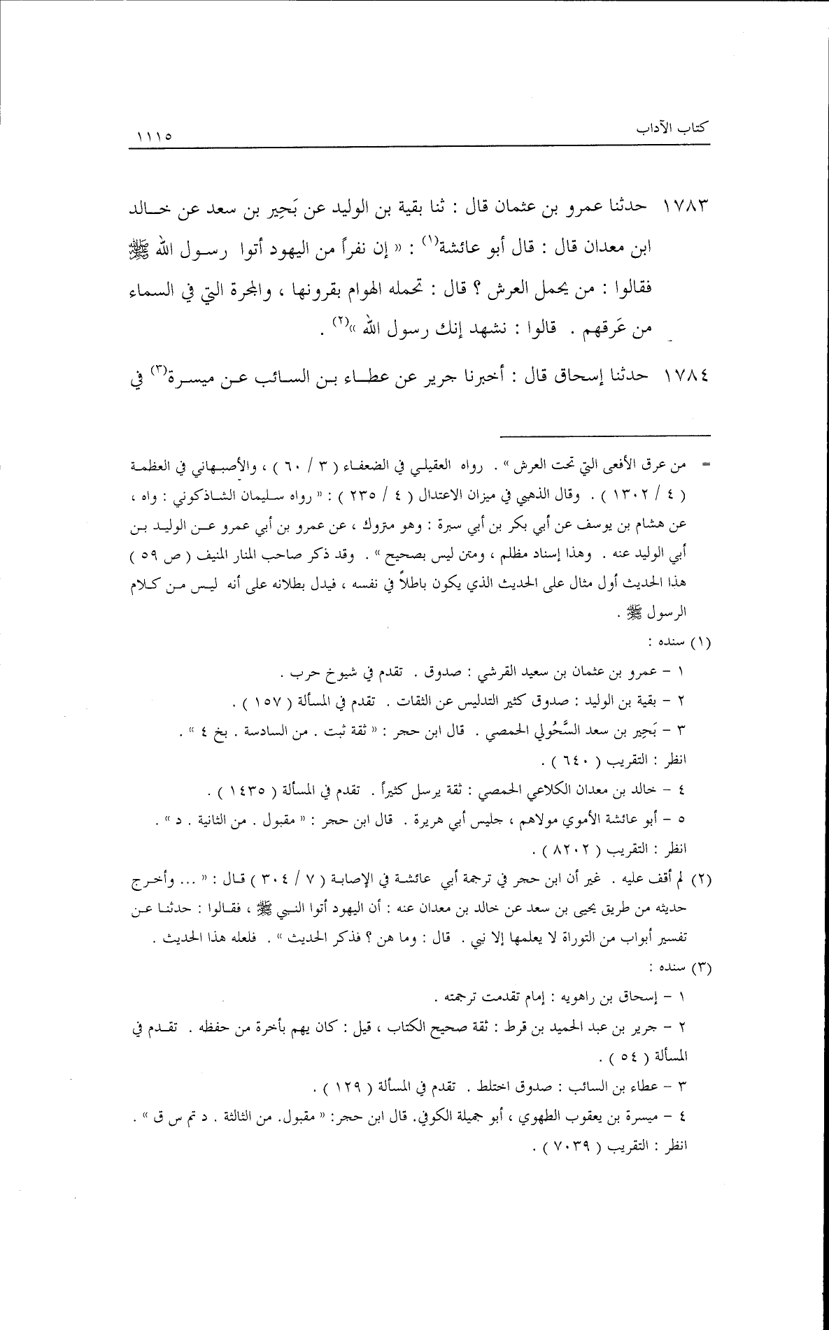 حدثنا عمرو بن عثمان قال: ثنا بقية بن الوليد، عن يحيى بن سعد، عن خالد بن معدان قال: قال أبو عائشة: إن نفرًا من اليهود أتوا رسول الله - صلى الله عليه وسلم - فقالوا: من يحمل العرش؟ قال: ((تحمله الهوام بقرونها، والمجرة التي في السماء من عرقهم)) قالوا: نشهد إنك رسول الله.