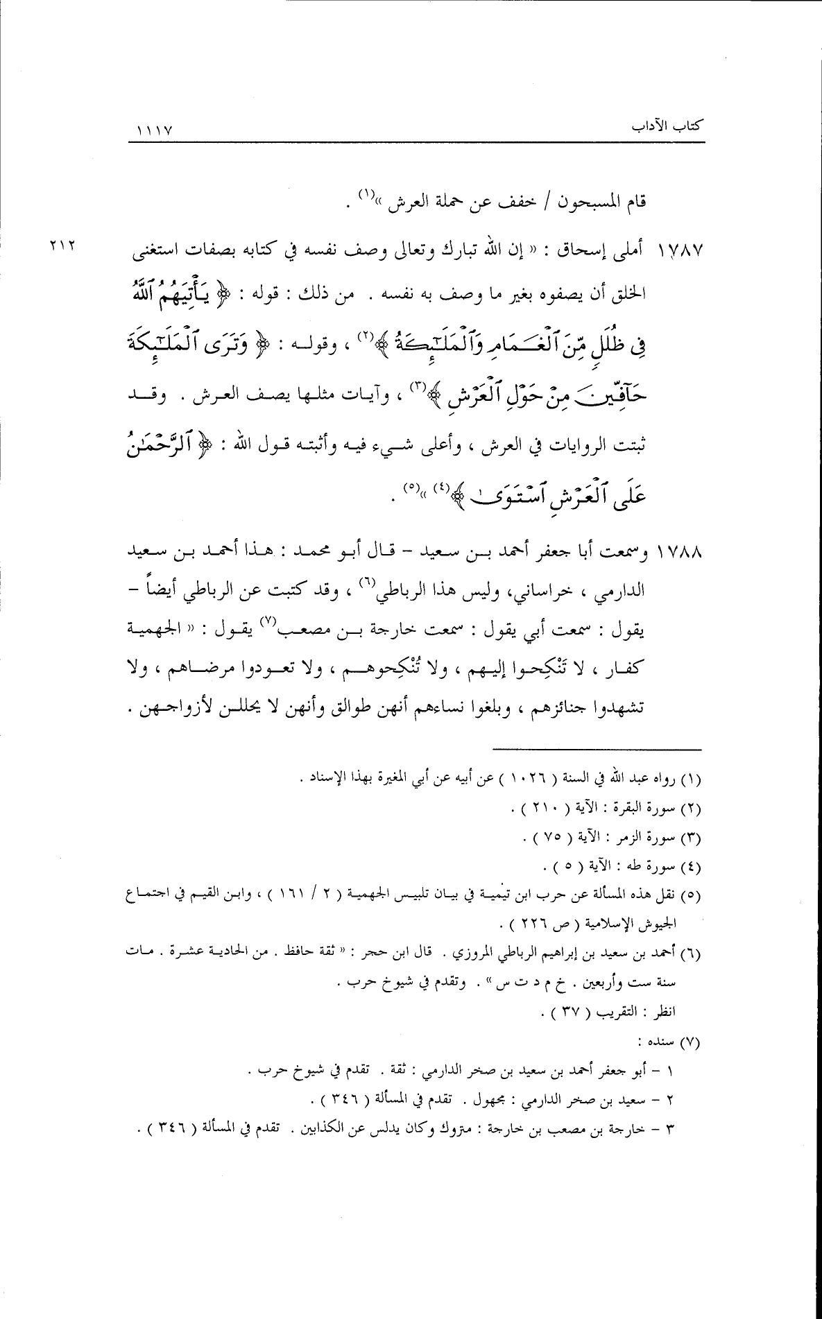 أملى إسحاق أن الله تبارك وتعالى وصف نفسه في كتابه بصفات استغنى الخلق أن يصفوه بغير ما وصف به نفسه، من ذلك قوله: {يَأْتِيَهُمُ اللهُ فِي ظُلَلٍ مِّنَ الْغَمَامِ وَالْمَلآئِكَةُ} [البقرة: 210] وقوله: {وَتَرَى الْمَلَائِكَةَ حَافِّينَ مِنْ حَوْلِ الْعَرْشِ} وآيات مثلها تصف العرش، وقد ثبتت الروايات في العرش، وأعلى شيء فيه وأثبته قول الله: {الرَّحْمَنُ عَلَى الْعَرْشِ اسْتَوَى} [طه: 5].