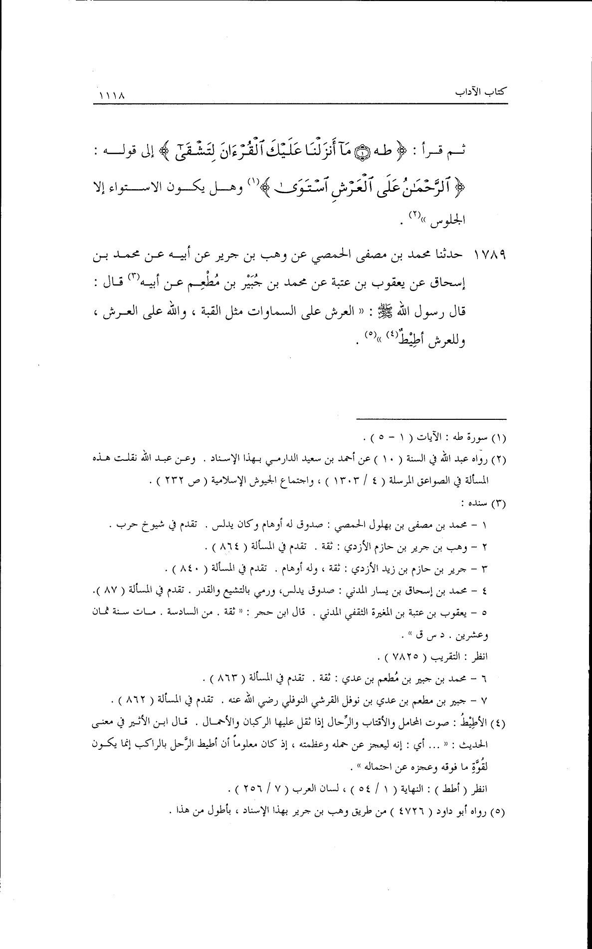 حدثنا محمد بن مصفا الحمصي، عن وهب بن جرير، عن أبيه، عن محمد بن إسحاق، عن يعقوب بن عتبة، عن محمد بن جبير بن مطعم، عن أبيه قال: قال رسول الله - صلى الله عليه وسلم -: ((العرش على السموات مثل القبة، والله على العرش، وللعرش أطيط)).