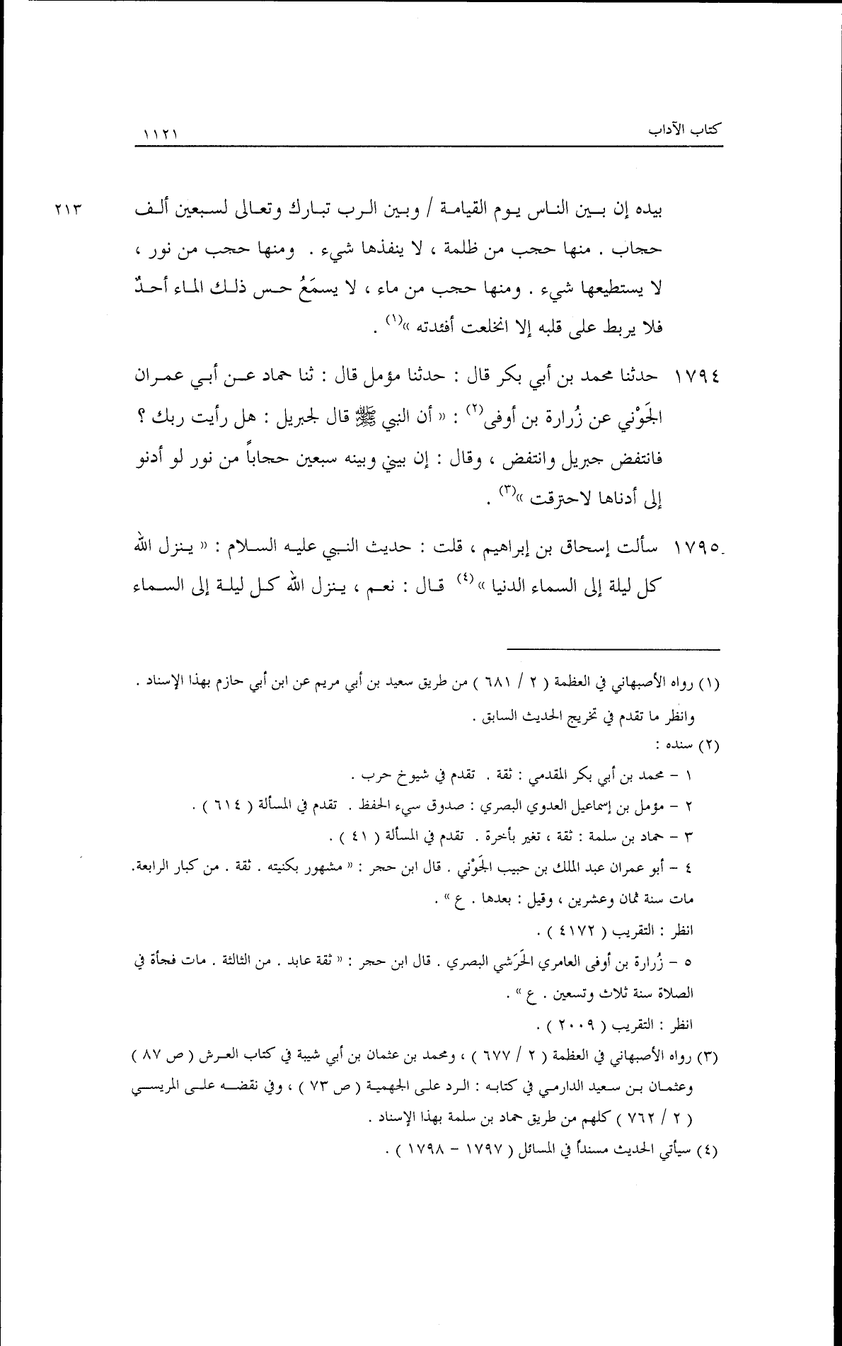 حدثنا محمد بن أبي بكر قال: حدثنا مؤمل قال: ثنا حماد، عن أبي عمران الجوني، عن زرارة بن أوفى أن النبي - صلى الله عليه وسلم - قال لجبريل: ((هل رأيت ربك؟)) فانتفض جبريل وانتفض، وقال: إن بيني وبينه سبعين حجابًا من نور، لو أدنوا إلى أدناها لاحترقت.