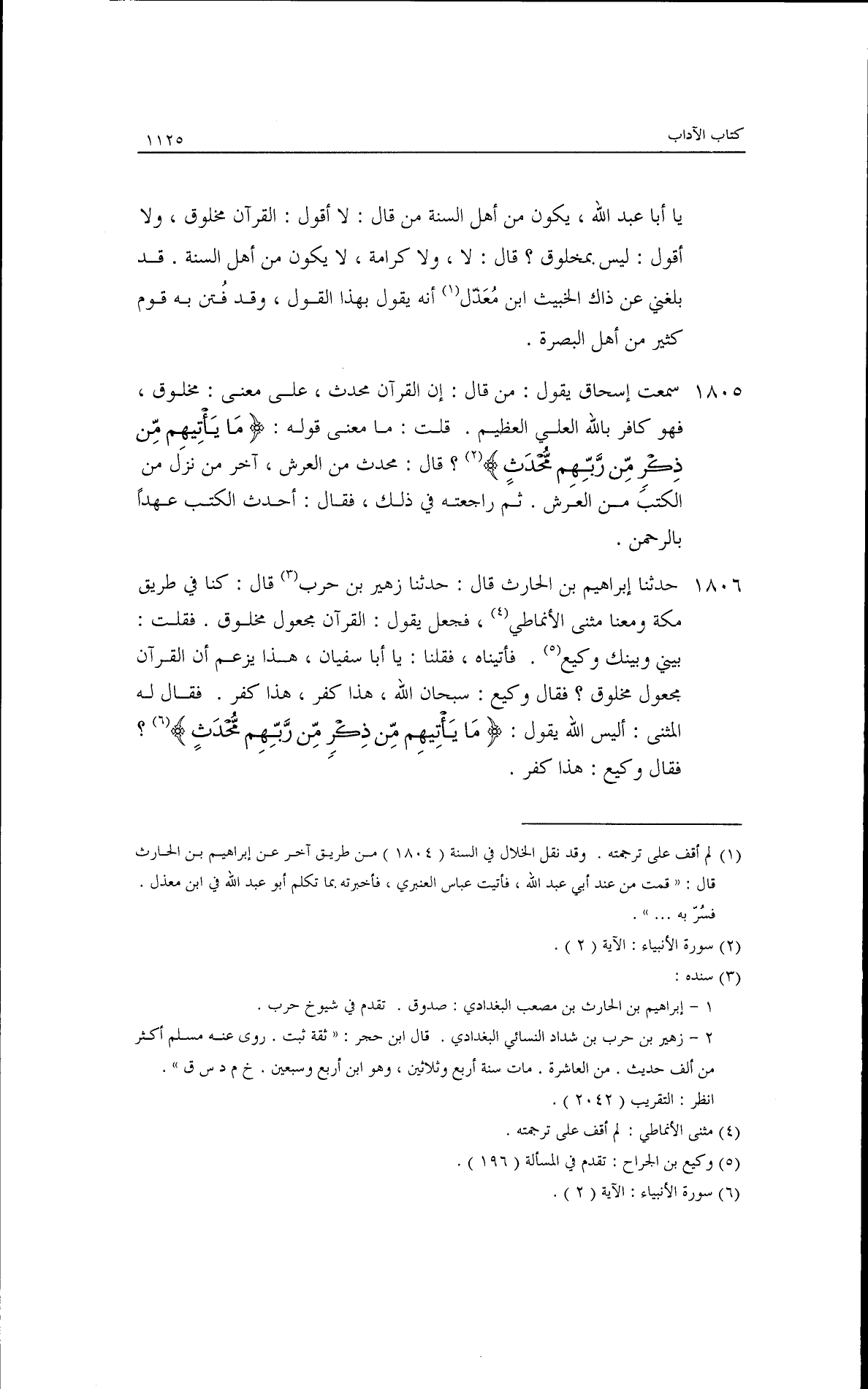 حدثنا إبراهيم بن الحارث، قال: ثنا زهير بن حرب، قال: كنا في طريق مكة ومعنا مثنى الأنماطي، فجعل يقول: القرآن مجعول مخلوق. فقلت: وبينك بيني وكيع، فأتيناه، فقلنا: يا أبا سفيان إن هذا يزعم أن القرآن مجعول مخلوق؟ فقال وكيع: سبحان الله هذا كفر هذا كفر، فقال له المثنى: أليس الله يقول: {مَا يَأْتِيهِم مِّن ذِكْرٍ مَّن رَّبِّهِم مُّحْدَثٍ} فقال وكيع: هذا كفر.
