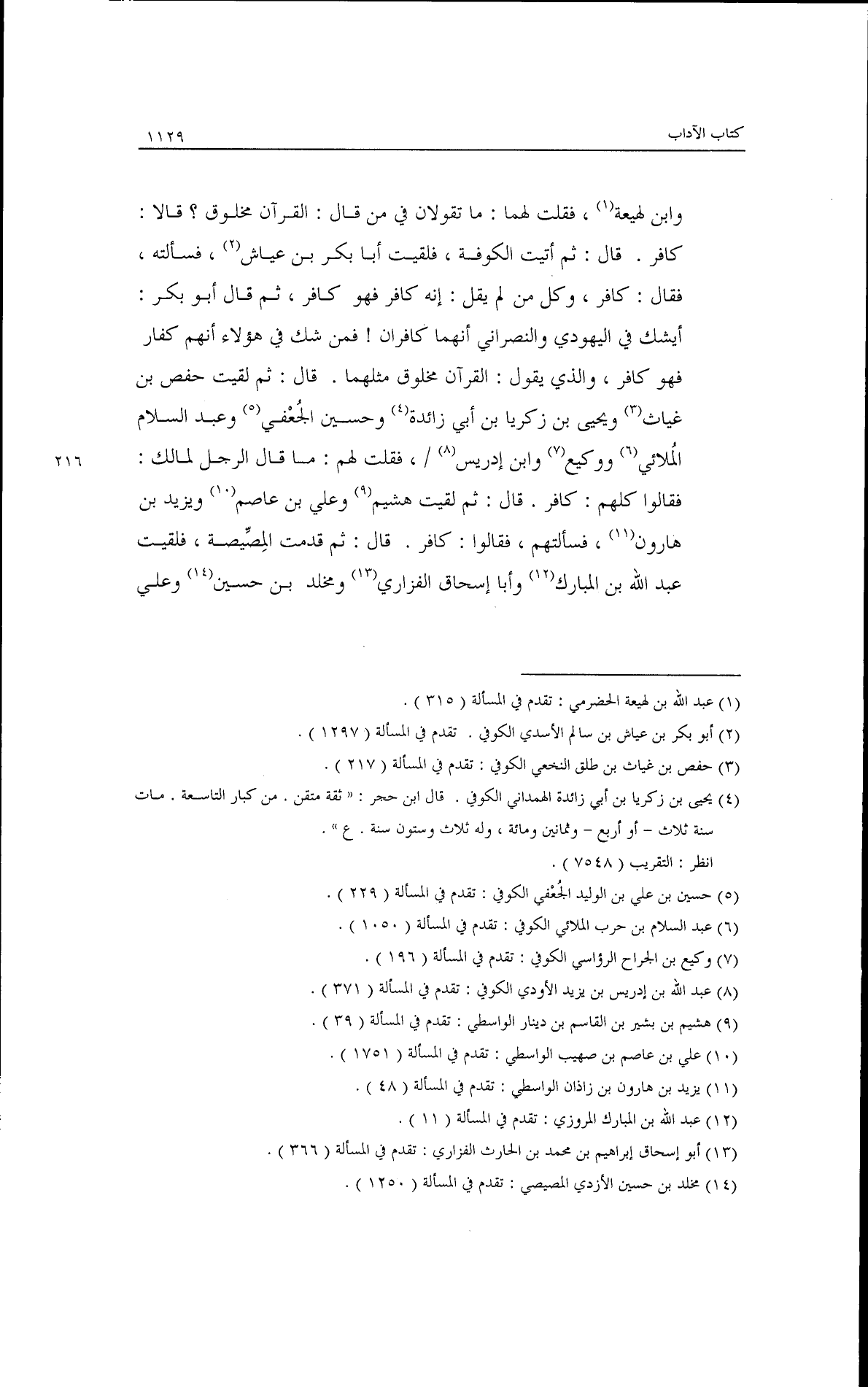 وابن لهيعة فقلت لهما: ما تقولان فيمن قال: القرآن مخلوق؟ قالا: كافر. قال: ثم أتيت الكوفة فلقيت أبا بكر بن عياش فسألتُه فقال: كافر؟ وكل من لم يقل إنه كافر فهو كافر، قال أبو بكر: أيشك في اليهودي والنصراني أنهما كافران؟ فمن شك في هؤلاء أنهم كفار فهو كافر، والذي يقول القرآن مخلوق مثلهما، قال: ثم لقيت حفص بن غياث، ويحيى بن زكريا بن أبي زائدة، وحسين الجعفي، وعبد السلام الملائي، ووكيع، وابن إدريس/211/ فقلت لهم ما قال الرجل لمالك فقالوا كلهم: كافر. قال: ثم لقيت هشيم وعلي بن عصام، ويزيد بن هارون فسألتُهم فقالوا: كافر، ثم قدمت المصيصة فلقيت عبد الله بن المبارك وأبا إسحاق الفزاري، ومخلد بن حسين، وعلي