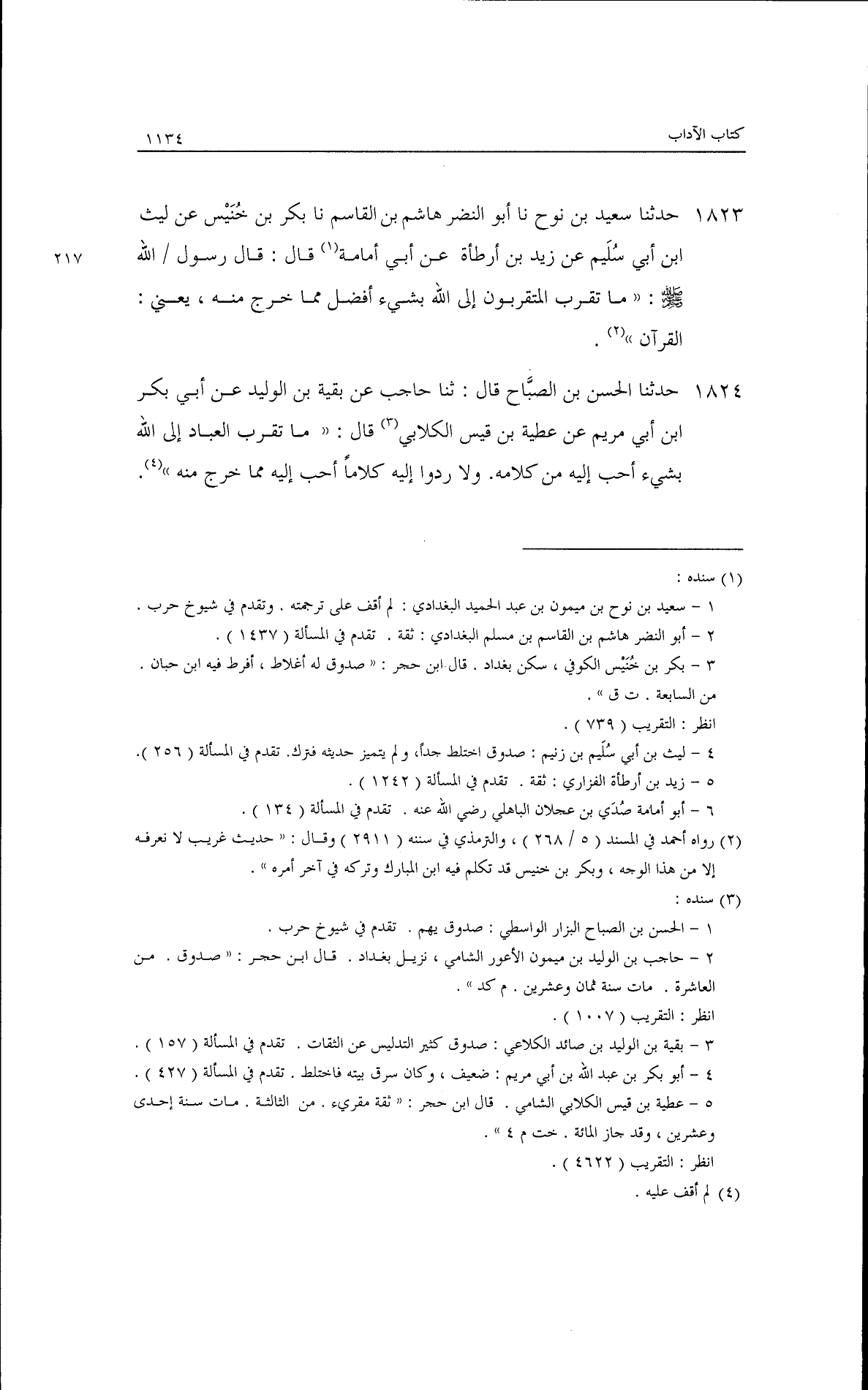 حدثنا سعيد بن نوح، نا أبو النضر هاشم بن القاسم، ثنا بكر بن خنيس، عن ليث بن أبي سليم، عن زيد بن أرطأة، عن أبي أمامة قال: قال رسول الله - صلى الله عليه وسلم -: ((ما تقرب المتقربون إلى الله بشيء أفضل مما خرج منه)) يعني: القرآن.