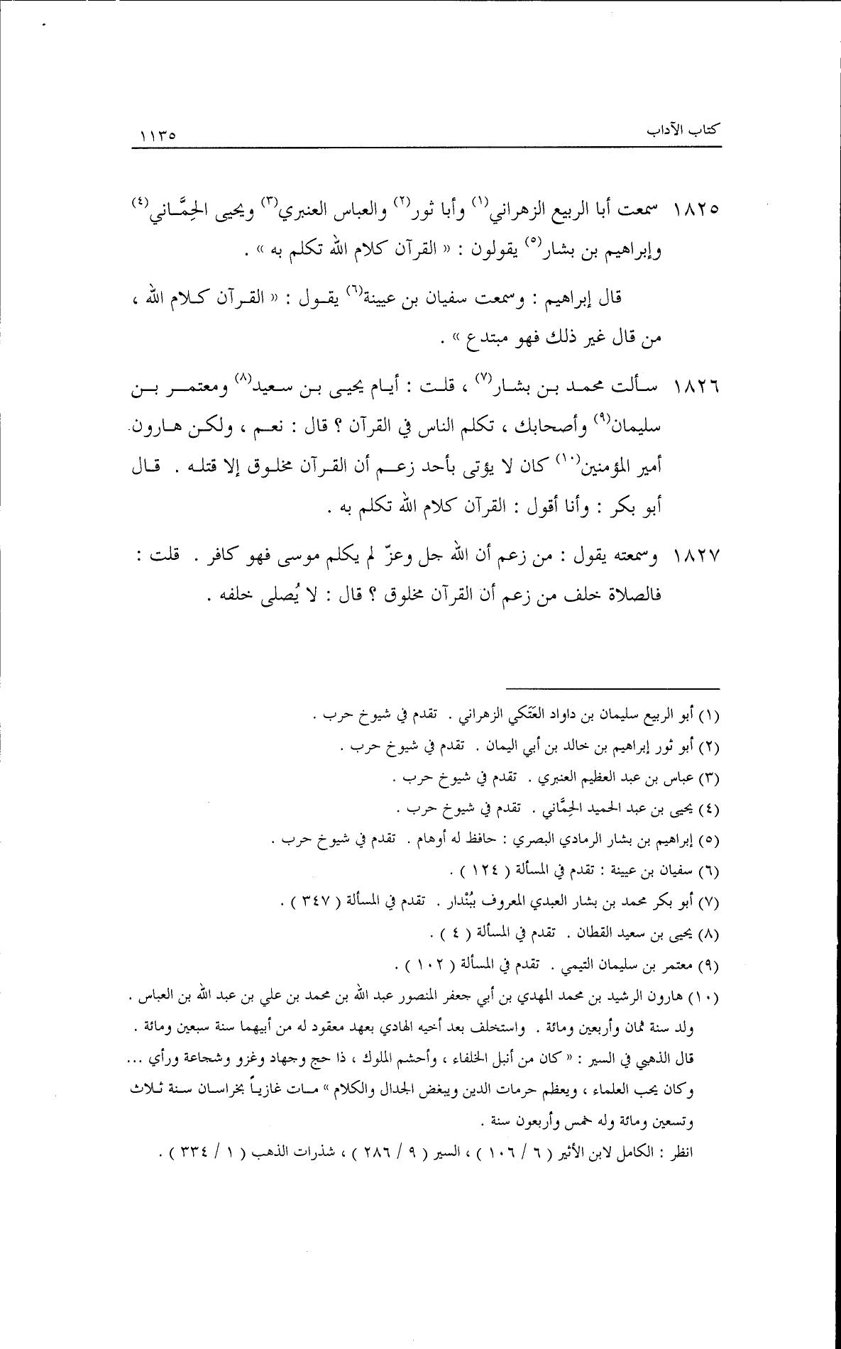 سمعت أبا الربيع الزهراني، وأبا ثور، والعباس العنبري، ويحيى الحمالي، وإبراهيم بن بشار يقولون: القرآن كلام الله تكلم به.