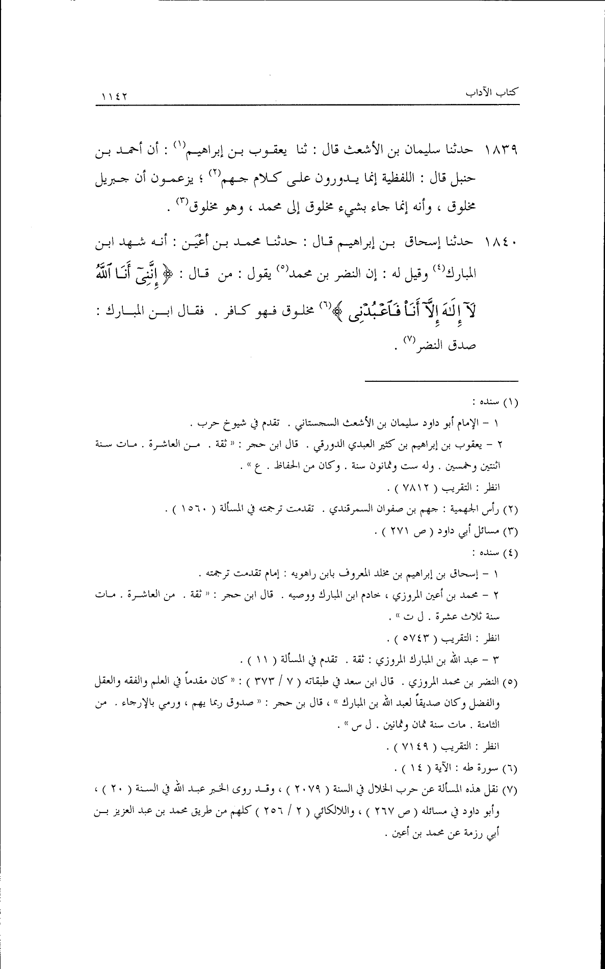 حدثنا سليمان بن الأشعث، قال: ثنا يعقوب بن إبراهيم أن أحمد بن حنبل قال: اللفظية إنما يدورون إن على كلام جهم، يزعمون أن جبريل مخلوق وأنه إنما جاء بشيء مخلوق إلى محمد وهو مخلوق. حدثنا إسحاق بن إبراهيم، قال: حدثنا محمد بن أعين أنه شهد ابن المبارك وقيل له: إن النضر بن محمد يقول من قال: {إِنَّنِي أَنَا اللَّهُ لا إِلَهَ إلا أَنَا فَاعْبُدْنِي} [طه: 14] مخلوق فهو كافر. فقال ابن المبارك: صدق النضر.