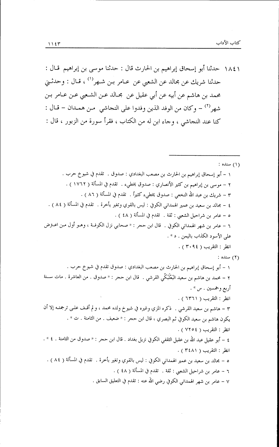 حدثنا أبو إسحاق إبراهيم بن الحارث، قال: حدثنا موسى بن إبراهيم، قال: حدثنا شريك، عن مجالد، عن الشعبي، عن عامر بن شهر، قال: وحدثني محمد بن هاشم، عن أبيه، عن أبي عقيل، عن مجالد، عن الشعبي، عن عامر بن شهر وكان من الوفد الذين وفدوا على النجاشي من همدان قال: كنا عند النجاشي وجاء ابن له عن الكتاب، فقرأ سورة من الزبور، قال: