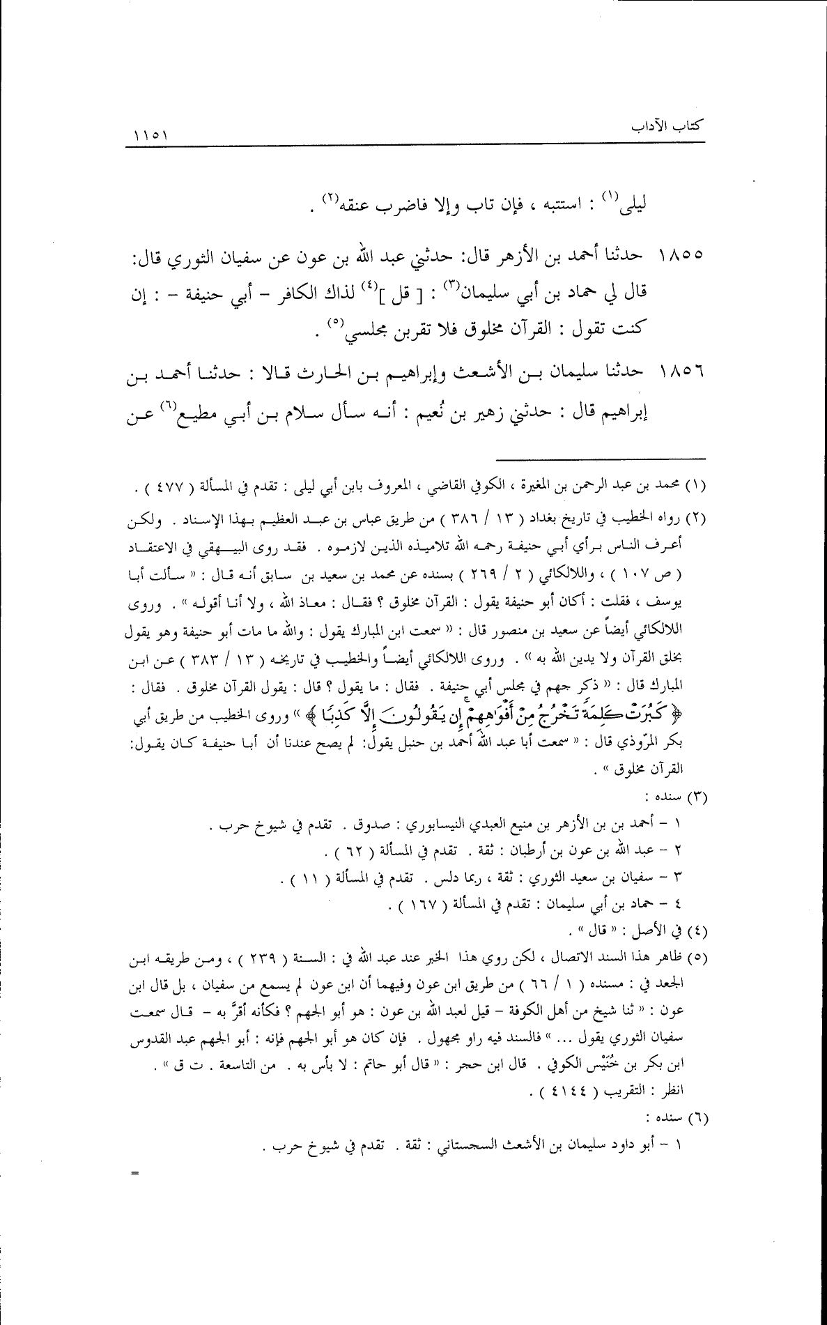 ليلى: استتبه فإن تاب وإلا فاضرب عنقه. حدثنا أحمد بن الأزهر قال: حدثني عبد الله بن عون، عن سفيان الثوري قال: قال لي حماد بن أبي سليمان قال لذاك الكافر: أبي حنيفة إن كنت تقول القرآن مخلوق، فلا تقربن مجلسي. حدثنا سليمان بن الأشعث وإبراهيم بن الحارث، قالا: حدثنا أحمد بن إبراهيم قال: حدثني زهير بن نعيم أنه سأل سلام بن أبي مطيع عن