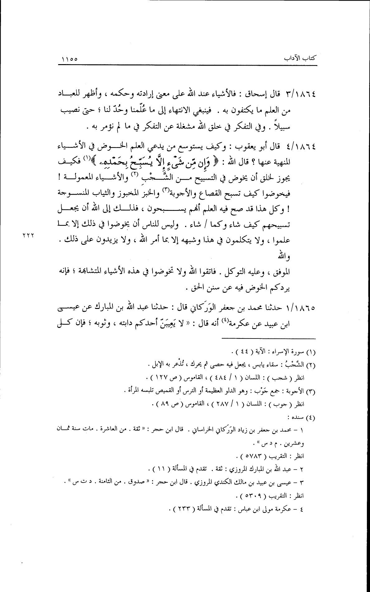 قال إسحاق: فالأشياء عند الله على معنى إرادته وحكمه، وأظهر للعباد من العلم ما يكتفون به، فينبغي الانتهاء ما عُلِّمْنَا، وَحُدَّ لنا حتى نصيب سبيلا في التفكر في خلق الله مشغلة عن التفكر فيما لم نؤمر به. قال أبو يعقوب: وكيف يستوسع من يدعي العلم الخوض في الأشياء المنهية عنها قال الله: {وَإِن مِّن شَيْءٍ إلا يُسَبِّحُ بِحَمْدَهِ} [الإسراء: 44] فكيف يجوز لخلق أن يخوض في التسبيح من الشجب والأشياء المعمولة فيخوضوا كيف يسبح القصاع والأجوبة والحبر المجنون. والثياب المنسوجة، وكل هذا قد صح فيه العلم أنهم يسبحون فذلك إلى الله أن يجعل تسبيحهم كيف شاء وكما/229/شاء، وليس للناس أن يخوضوا في ذلك إلا بما علموا، ولا يتكلموا في هذا وشبهه إلا بما أمر الله ولا يزيدون على ذلك، والله الموفق، وعليه التوكل، فاتقوا الله، ولا تخوضوا في هذه الأشياء المتشابهة، فإنه يردكم الخوض فيه عن سنن الحق. حدثنا محمد بن جعفر الوركاني، قال: حدثنا عبد الله بن المبارك، عن عيسى بن عبيد، عن عكرمة أنه قال: لا يعيبن أحدكم دابته وثوبه، فإن كل