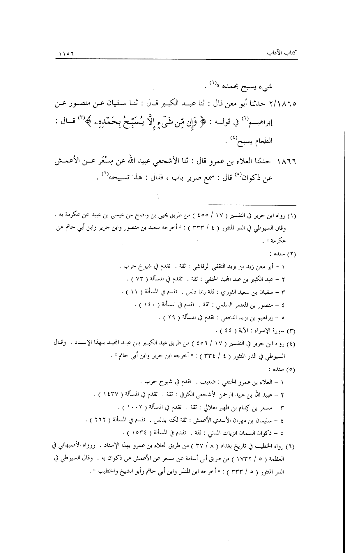شيء يسبح بحمده. حدثنا أبو معن قال: ثنا عبد الكبير قال: ثنا سفيان، عن منصور، عن إبراهيم في قوله: {وَإِن مِّن شَيْءٍ إلا يُسَبِّحُ بِحَمْدَهِ} قال: الطعام يسبح. حدثنا العلاء بن عمرو، قال: ثنا الأشجعي عبيد الله، عن مسعر، عن الأعمش، عن ذكوان قال: سمع صرير باب فقال: هذا تسبيحه.