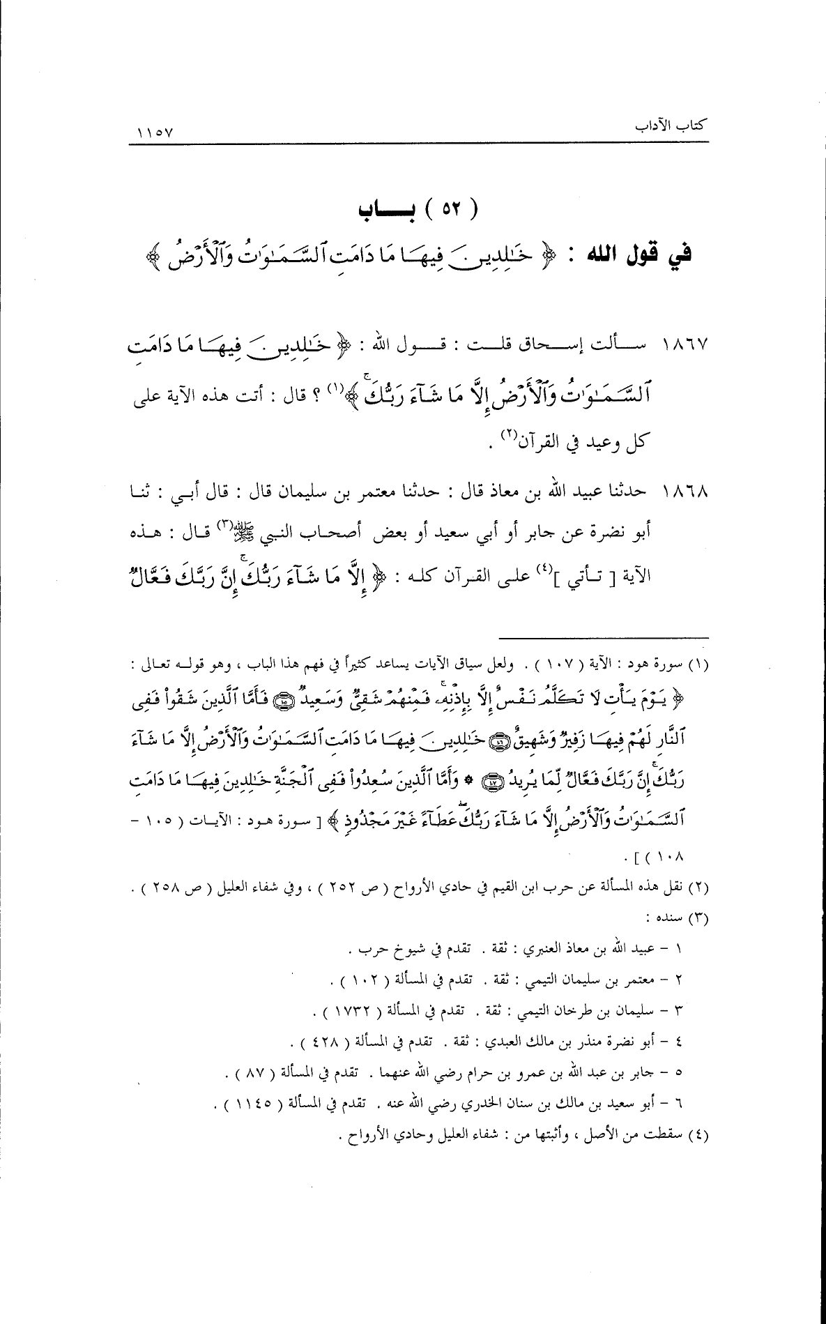 سألتُ إسحاق قلت: قول الله: {خَالِدِينَ فِيهَا مَا دَامَتِ السَّمَاوَاتُ وَالأرْضُ إلا مَا شَاء رَبُّكَ} قال: أتت هذه الآية على كل وعيد في القرآن. حدثنا عبيد الله بن معاذ قال: حدثنا معتمر بن سليمان قال: قال أبي: ثنا أبو نضرة، عن جابر زو أبي سعيد زو بعض أصحاب النبي - صلى الله عليه وسلم - قال: هذه الآية على القرآن كله {إلا مَا شَاء رَبُّكَ إِنَّ رَبَّكَ فَعَّالٌ