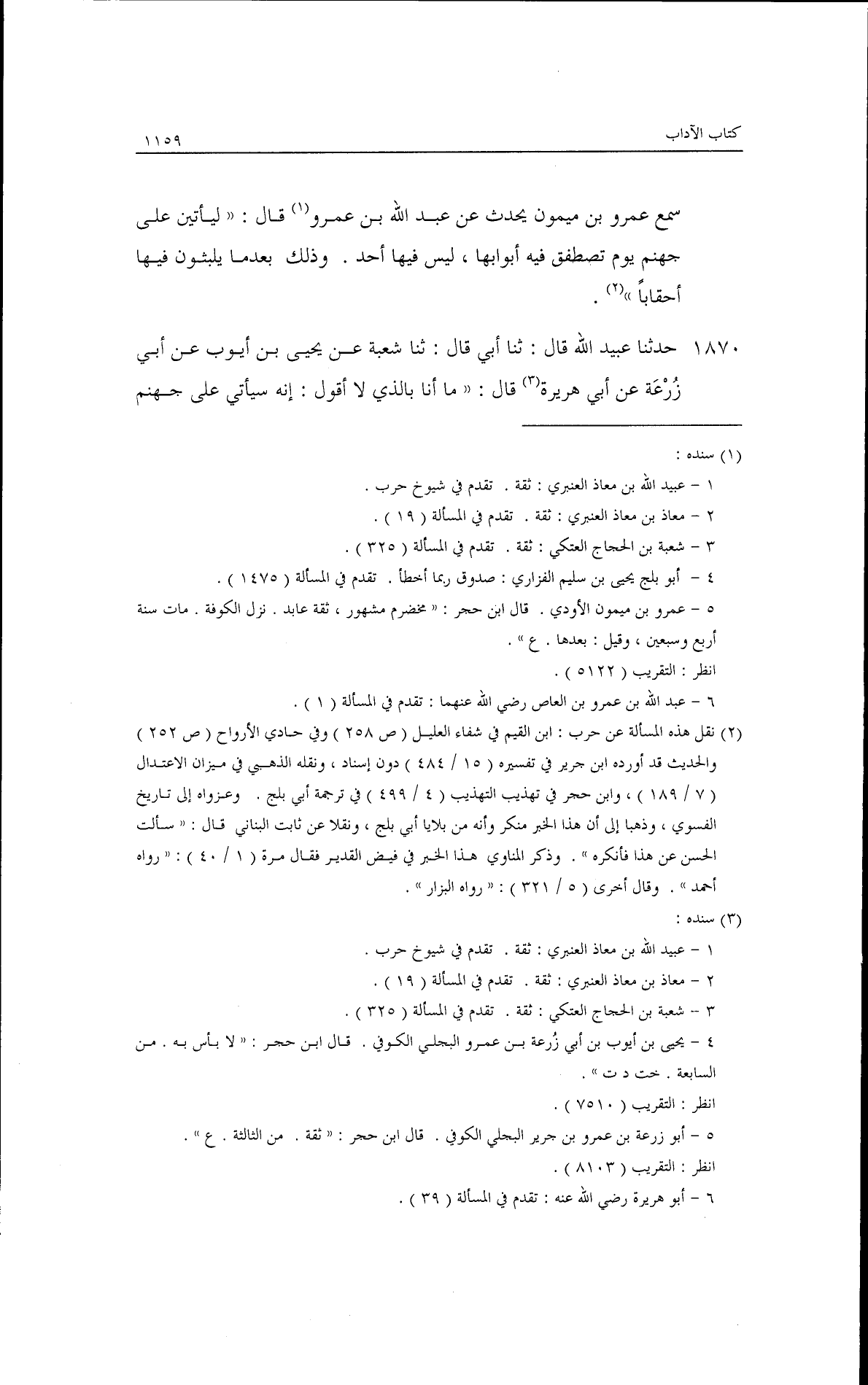 سمع عمرو بن ميمون يحدث عن عبد الله بن عمر وقال: ليأتين على جهنم يوم يصطفق فيه أبو ابها ليس فيها أحد وذلك بعدما يلبثون فيها أحقابا. حدثنا عبيد الله، قال: ثنا أبي، قال: ثنا شعبة، عن يحيى بن أيوب، عن زرعة، عن أبي هريرة قال: ما أنا بالذي لا أقول إنه سيأتي على جهنم