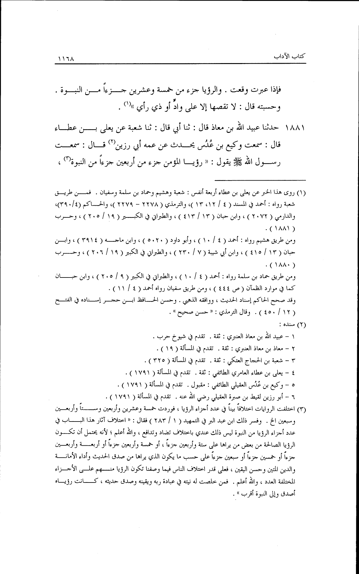 فإذا عبرت وقعت، والرؤيا جزء من خمسة وعشرين جزءًا من النبوة)) وحسبته قال: ((لا تقصها إلا على وادٍ، أوذي رأي)). حدثنا عبيد الله بن معاذ قال: ثنا أبي قال: ُنا شعبة، عن يعلى بن عطا، قال: سمعت وكيع بن عدس يحدث عن عمه أبي رزين قال: سمعت رسول الله - صلى الله عليه وسلم - يقول: ((رؤيا المسلم جزء من أربعين جزءًا من النبوة،