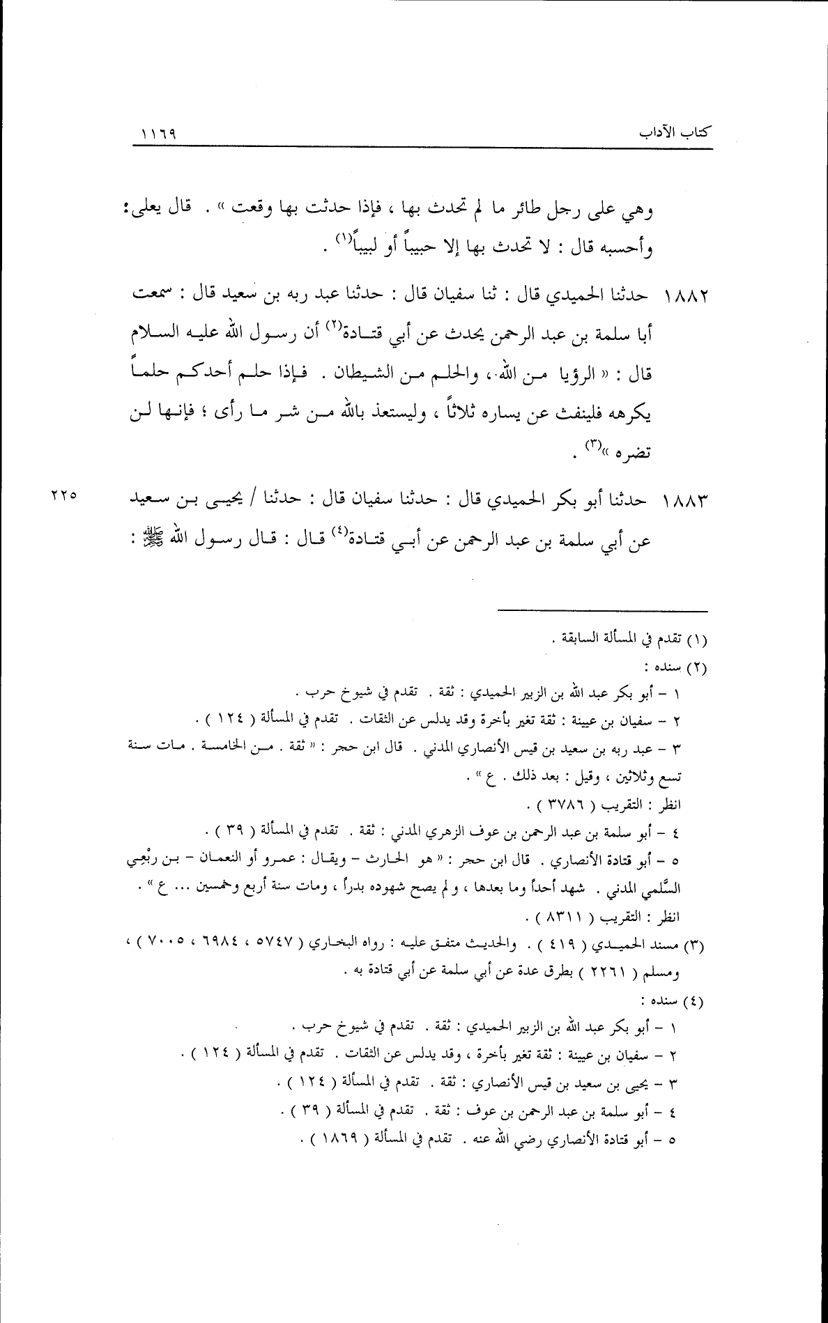 حدثنا الحميد، قال: قنا سفيان، قال: حدثنا عبد ربه بن سعيد قال: سمعت أبا سلمة بن عبد الرحمن يحدث، عن أبي قتادة أن رسول الله عليه السلام قال: ((الرؤيا من الله، والحلم من الشيطان، فإذا حلم أحدكم حلمًا يكرهه فلينفث عن يساره ثلاثا وليستعذ بالله من شرما رأى فإنها لن تضره)). حدثنا أبو بكر الحميدي قال: حدثنا/218/سفيان قال: حدثنا يحيى بن سعيد، عن أبي سلمة بن عبد الرحمن، عن أبي قتادة قال: قال رسول الله - صلى الله عليه وسلم -: