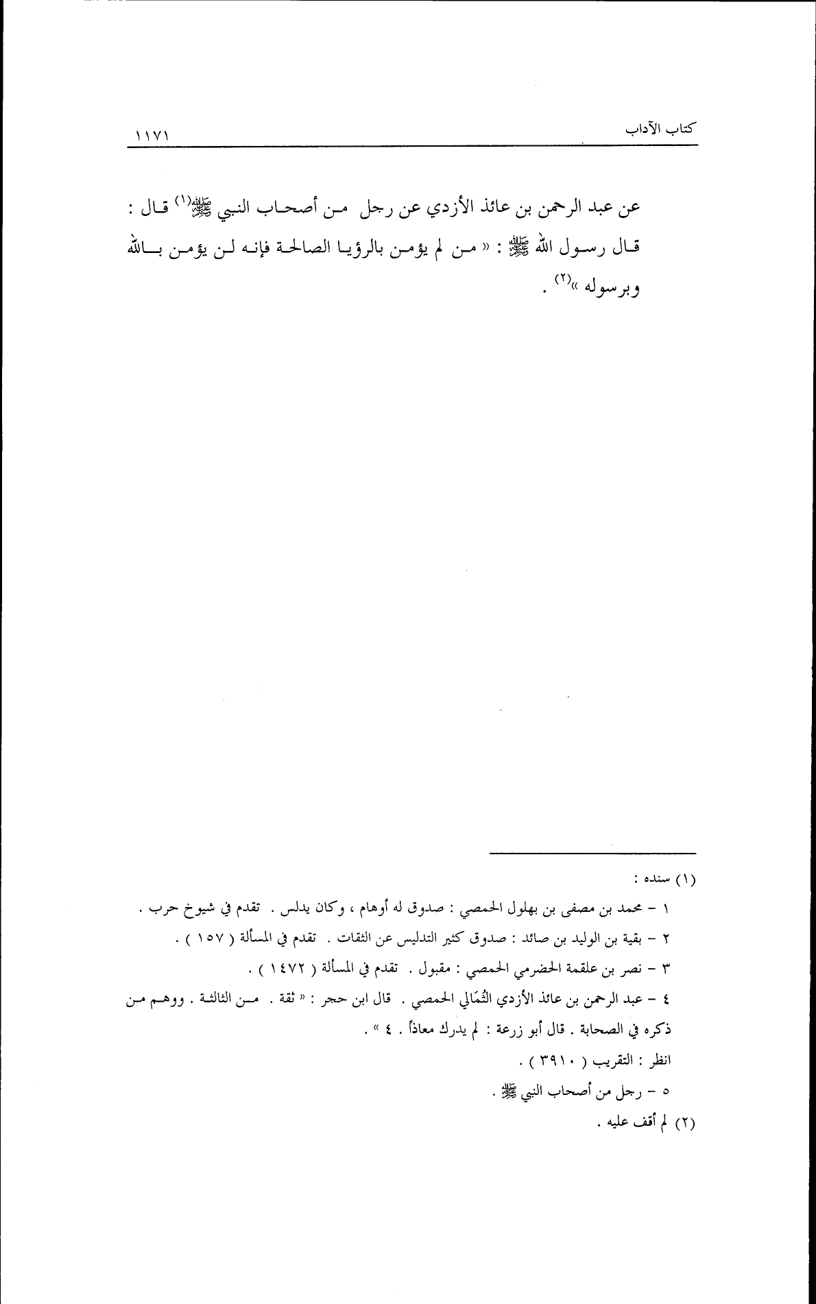 ((الرؤيا من الله والحلم من الشيطان، فإذا حلم أحدكم حلمًا يكرهه فلينفث عن يساره ثلاثا وليستعذ بالله من شر ما رأى، فإنها لن تضره)). حدثنا أبو عبد الله أحمد بن بشر، قال: حدثنا يزيد بن زريع، عن سعيد، عن قتادة عن محمد بن سيرين، عن أبي هريرة قال: قال رسول الله - صلى الله عليه وسلم -: ((الرؤيا ثلاث فرؤيا حق، ورؤيا يحدث بها الرجل نفسه، ورؤيا تخزين من الشيطان، فمن رأي ما يكره فليقم فليصل)) وكان يقول: يعجبني القيد وأكره الغل، والقيد ثبات في الدين، وكان يقول: ((من رأني فإني أنا هو، فإنه ليس للشيطان أن يتمثل بي)) وكان يقول: ((لا تقصن، أولا تقص الرؤيا إلا على عالم أو ناصح)). حدثنا محمد بن مصفى، قال: ثنا بقية بن الوليد، قال: حدثني نصر بن علقمة،