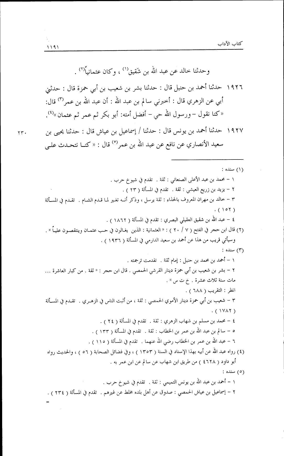 وسمعت هدبة بن خالد يقول: خير هذه الأمة بعد نبيها أبو بكر وعمر وعثمان وعلي. وسمعت أبا الربيع الزهراني يقول: خير هذه الأمة بعد نبيها أبو بكر ثم عمر، ثم عثمان، ثم نسكت. حدثنا عبيد الله بن معاذ، عن أبيه، عن بسر بن المفضل: عثمان أفضل من علي. قلت لعبيد الله بن معاذ: ما كان مذهب أبيك في هذا؟ قال: كان مذهب أبي أن عثمان أفضل من علي، يقول: أبو بكر، ثم عمر، ثم عثمان. حدثنا محمد بن عبد الأعلى، قال: حدثنا معتمر بن سليمان، قال: كان أبي يقول: خير الأمة أبو بكر، ثم عمر، ثم عثمان.
