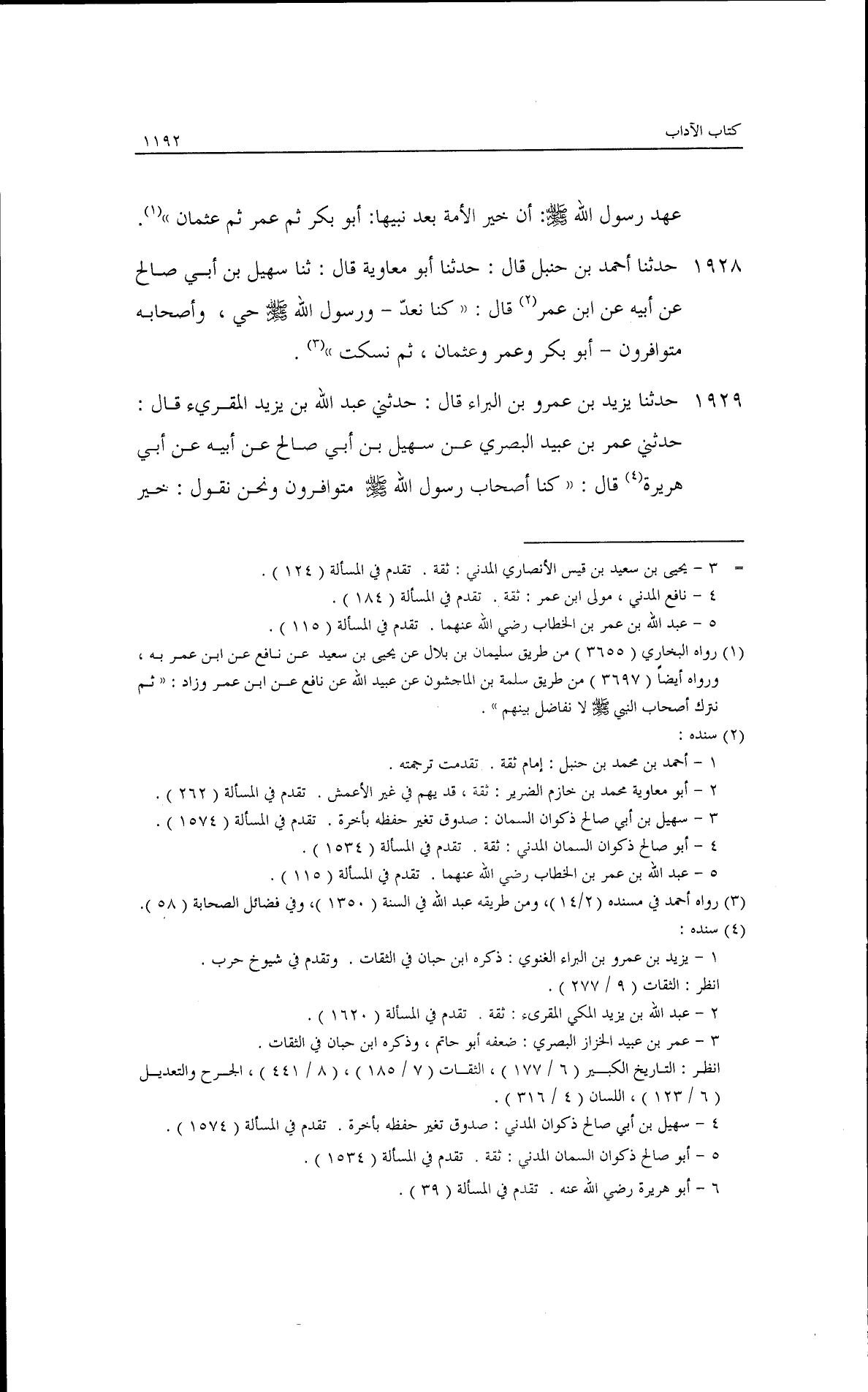 وحدثنا خالد بن عبد الله بن شقيق وكان عثمانيًا. حدثنا أحمد بن حنبل، قال: حدثنا بشر بن شعيب بن أبي حمزة، قال: حدثني أبي، عن الزهري قال: أخبرني سالم بن عبد الله أن عبد الله بن عمر قال: كنا نقول ورسول الله حي أفضل أمته: أبو بكر، ثم عمر، ثم عثمان. حدثنا أحمد بن يونس، قال: حدثنا إسماعيل بن عياش، قال: حدثنا يحيى بن سعيد الأنصاري، عن نافع، عن عبد الله بن عمر قال: كنا نتحدث على