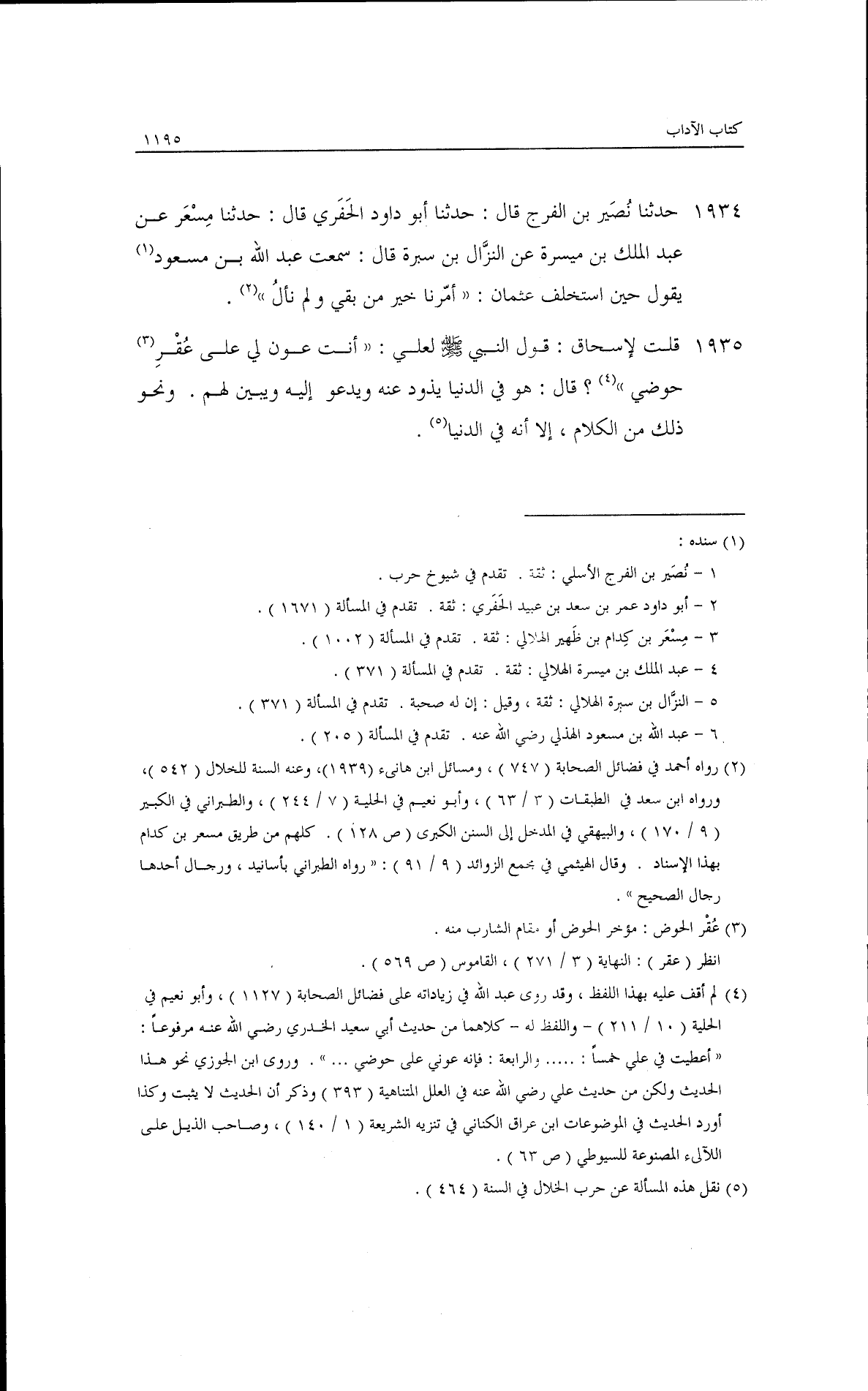 النجود، قال: قلت لزر بن حبيش: من عنى عليّ بالثالث؟ فقال زر: كان عليّ خيرًا من ذلك وأقرأ لكتاب الله من ذلك، وأعلم من ذلك أن يقوم على منبر رسول الله، ويعني نفسه، ولكن عنى بالثالث عثمان. سمعت إسحاق بن إبراهيم يقول: من قدم عليًا على عثمان فهو مخطئ. حدثنا أحمد بن سعيد، قال: سمعت النضر بن شميل يقول: من قال في بيعة عثمان فقد أزرى على عشرة آلاف من أصحاب رسول الله عليه السلام اجتمعوا فقدموا عثمان.