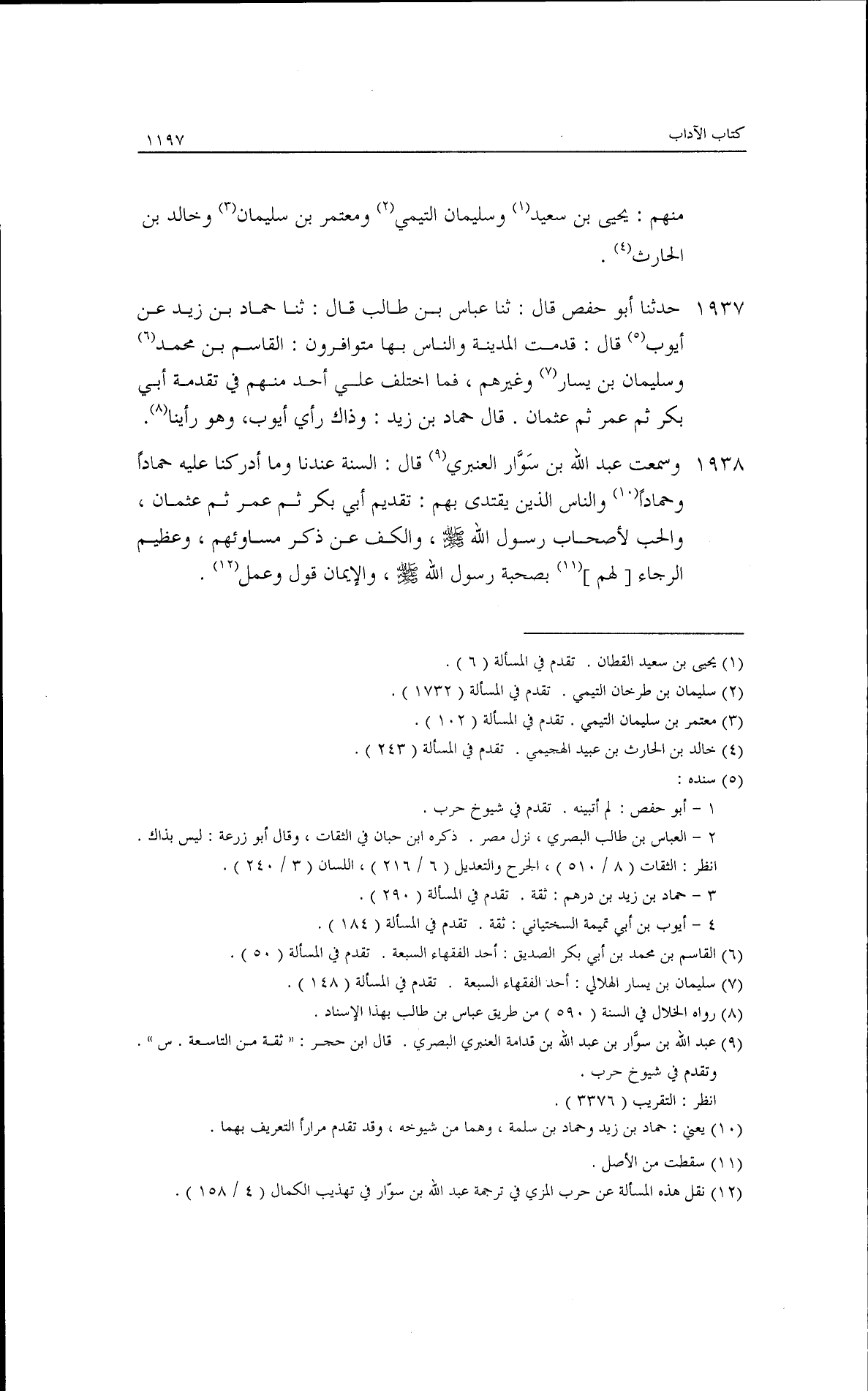 حدثنا أحمد بن سعيد قال: حدثنا الطنافسي قال: ثنا أبي قال: أدركت الناس وإنما يختلفون في علي وعثمان/224/فأما أبو بكر وعمر فليس فيهما اختلا ف. قال أحمد بن سعيد وكان الفقهاء مختلفين منهم من يقول: أبو بكر وعمر، ويقف منهم الشعبي، وإبراهيم والكوفيون، وسعيد بن جبير، وأبو البختري، وغيرهم، وعبيد بن عمير، وقوم من أهل البصرة وقفوا، وكان قوم يقولون: أبو بكر وعمر وعثمان وعلي، وكان قوم يقال لهم الشيعة وليسوا مخارجين ولا منسوبين إلى البدعة يقولون: أبو بكر وعمر وعلي، وكان قوم يقال لهم عثمانين يقولون: أبو بكر وعمر وعثمان ويسكتون منهم سعيد بن أبي عروبة، وحماد بن زيد، وهشام بن أبي عبد الله، وغيرهم، وكان قوم من أهل البصرة يقفون في علي وعثمان،