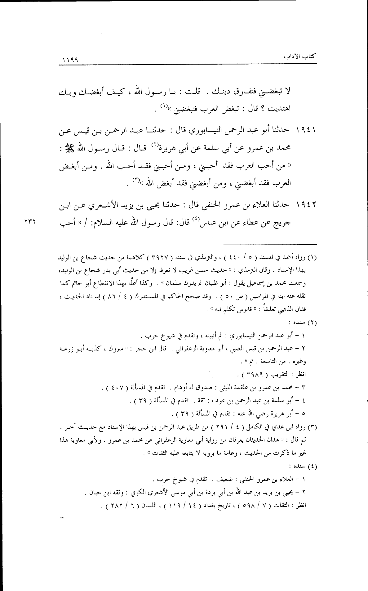 حدثنا يحيى بن عبد الحميد، قال: ثنا حصين بن عمر الأحمسي، قال: ثنا مخارق، عن طارق، عن عثمان قال: سمعت النبي - صلى الله عليه وسلم - يقول: ((من أحب العرب فبحبي أحبهم، ومن أبغض العرب فببغضي أبغضهم)). حدثنا أبو الربيع الزهراني، قال: ثنا شجاع بن الوليد، عن قأبوس بن أبي ظبيان، عن أبيه، عن سلمان قال: قال لي رسول الله - صلى الله عليه وسلم -: ((يا سلمان
