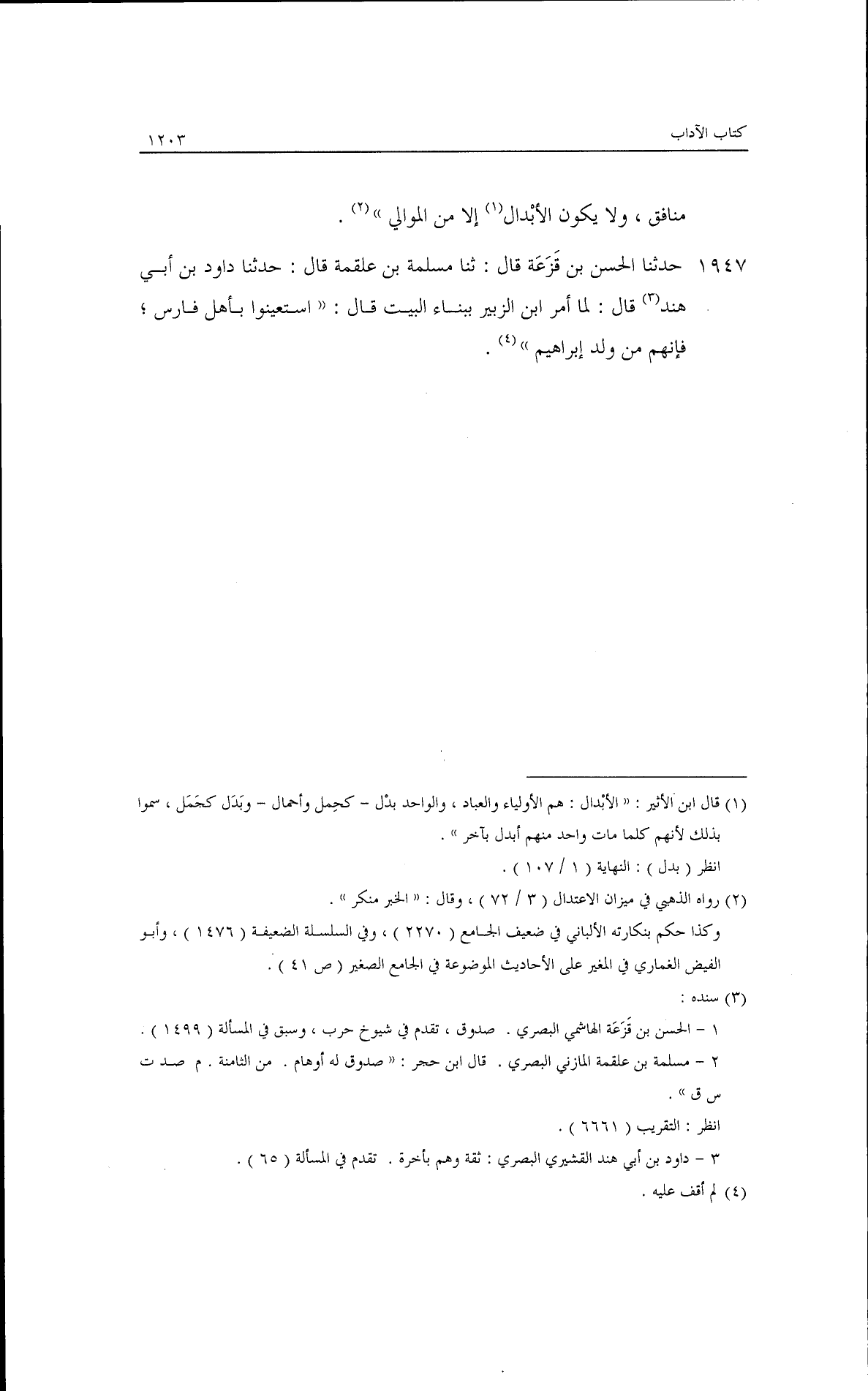 حدثنا يحيى بن عبد الحميد، قال: حدثنا سليمان - يعني: ابن بلال- عن عمرو بن أبي عمرو، عن عكرمة، عن ابن عباس قال: شهد بدرًا مع النبي عليه السلام عشرون رجلا من الموالي. حدثنا عبد الرحمن بن عبد الوهاب، قال: ثنا منصور بن زيد أبو عبد الرحمن الموصلي، قال: ثنا محمد بن فضيل بن غزوان، عن أبيه، عن الرجال بن سالم، عن عطا بن أبي رباح قال: قال رسول الله - صلى الله عليه وسلم -: ((لا يبغض الموالي إلا