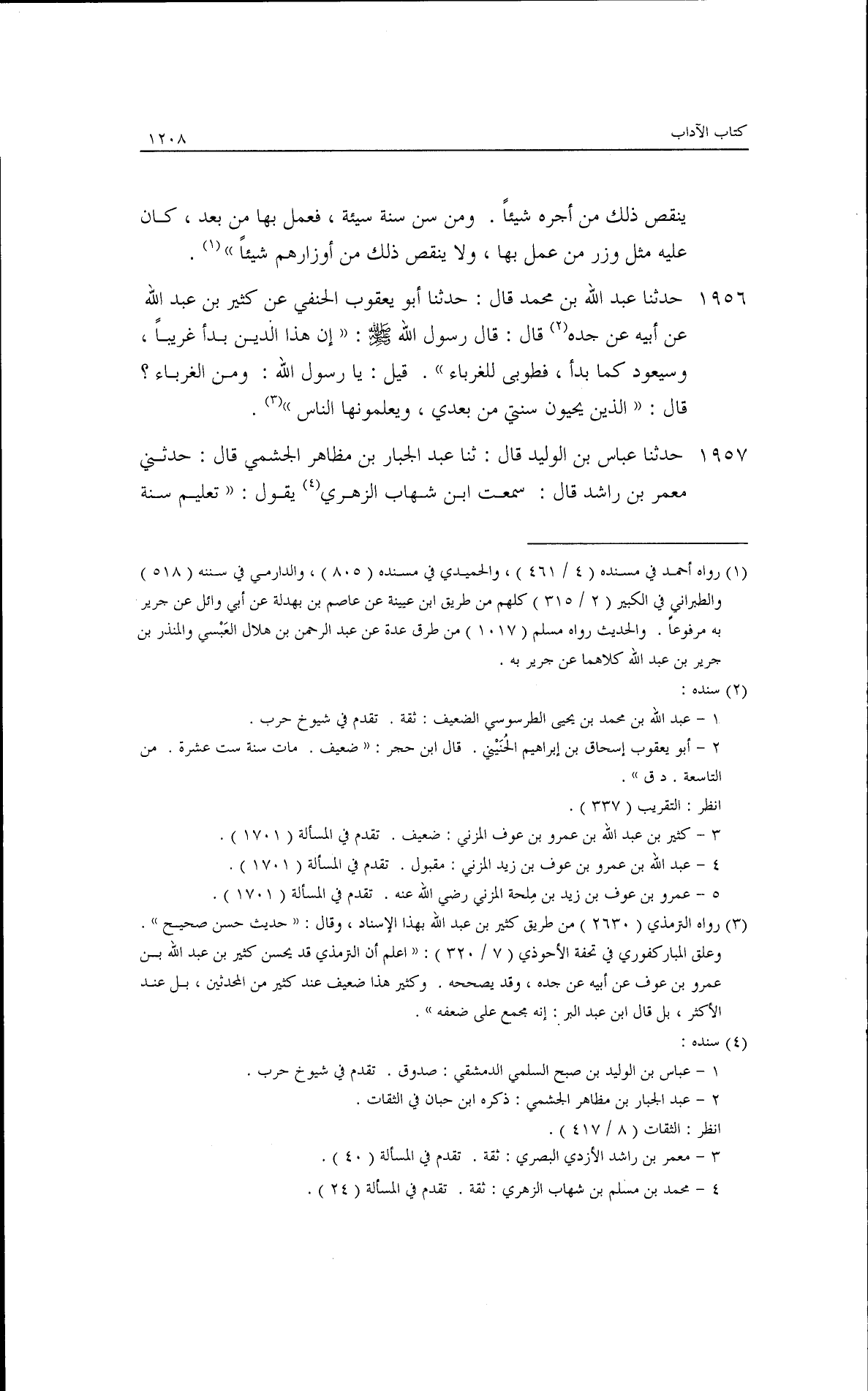 يعقوب بن محمد قال: كنا نعالج البز، فكان يمر بنا إسحاق بن بشار فيقول لنا: الزموا إجارتكم، فإن أباكم إبراهيم كان بزازًا. حدثنا أبو محمد عبد الله بن محمد بن يحيى قال: حدثنا سفيان بن عيينة، عن عياض، عن أبي دليل، عن جرير بن عبد الله، عن النبي - صلى الله عليه وسلم - قال: ((من سن سنّة حسنة فعمل بها من بعد كان له مثل أجر من عمل بها لا ينقص ذلك من أجره شيئًا، ومن سن سنّة سيئة فعمل بها من بعد كان عليه مثل وزر من عمل بها ولا